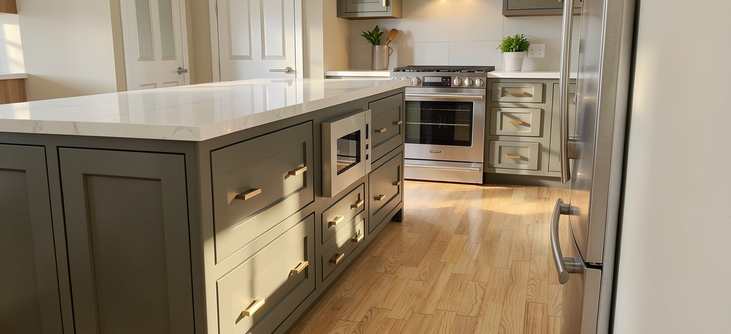 make the perimeter cabinetry soft white and island color pewter green