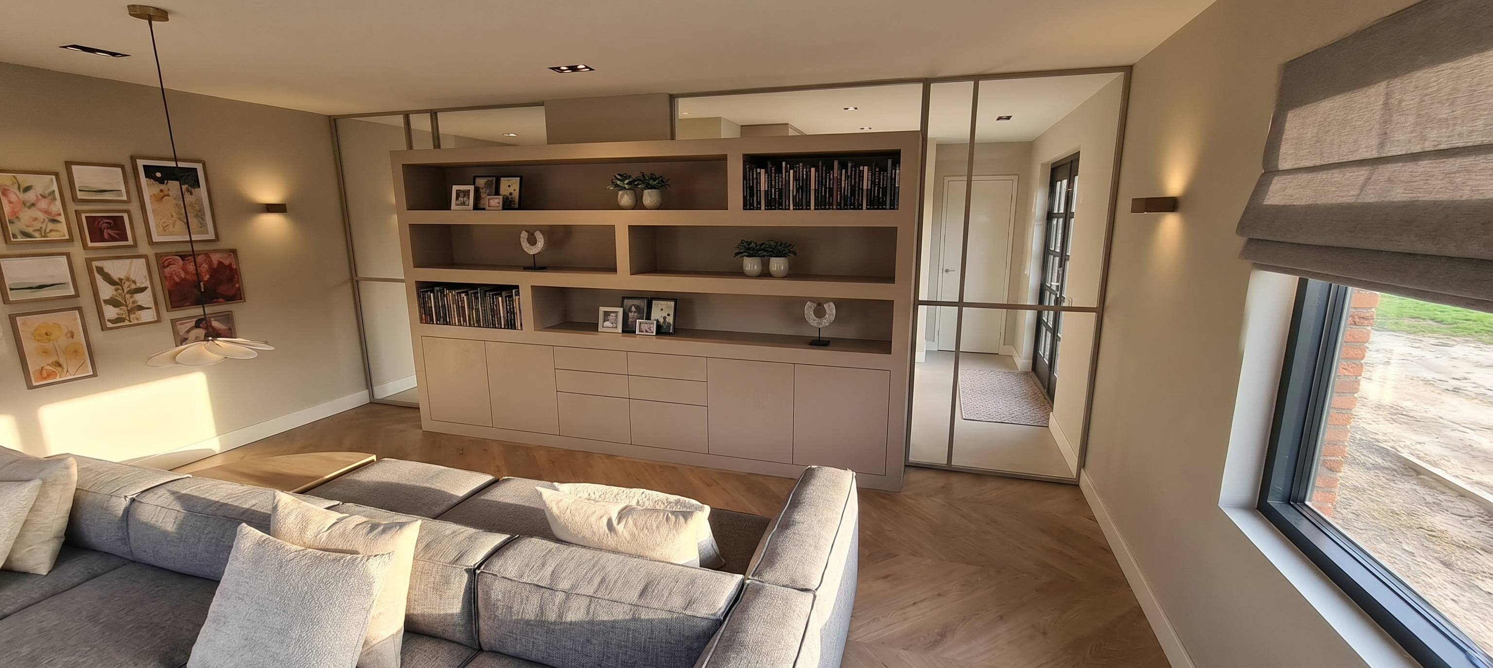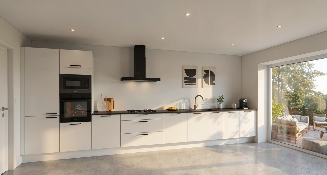 minimalism interior shot create a render with a japandi wabi sabi style kitchen with white walls and wooden carpentry make the render realistic with good lighting architecture