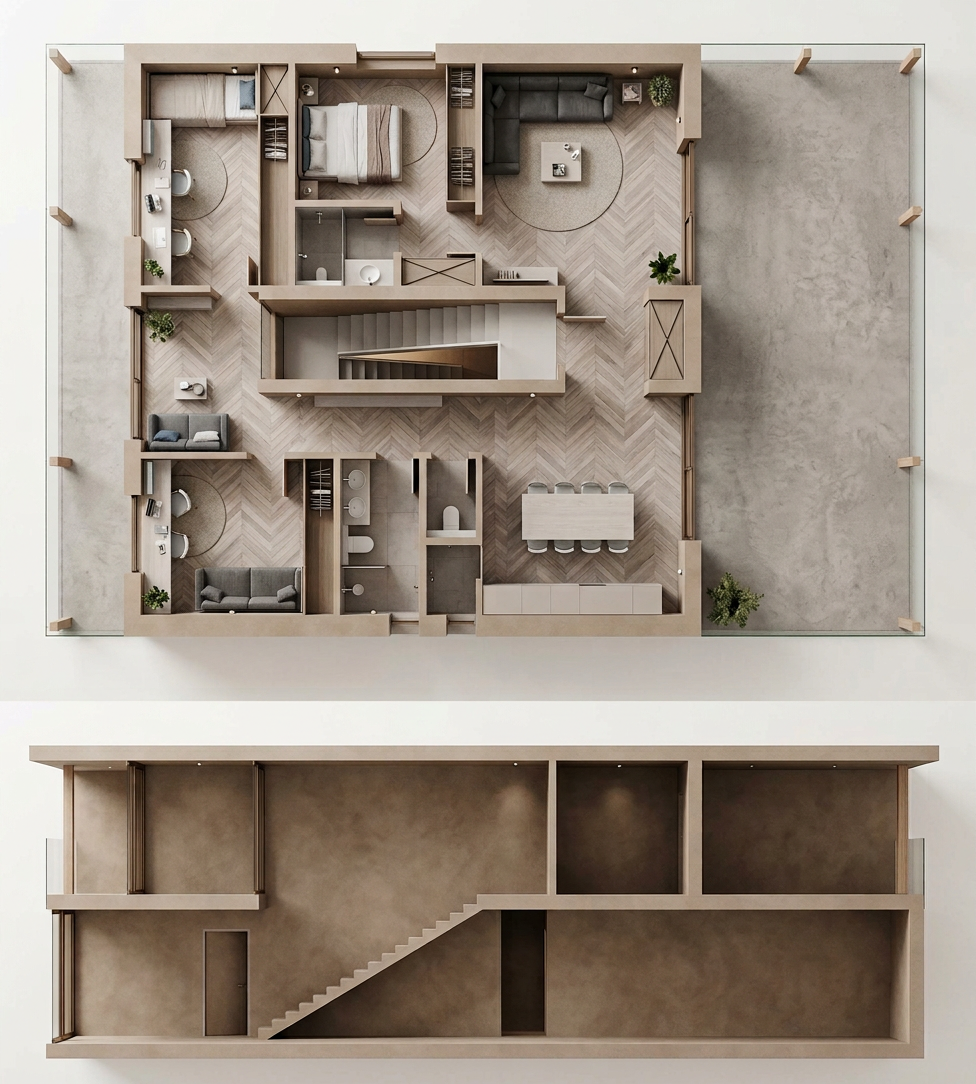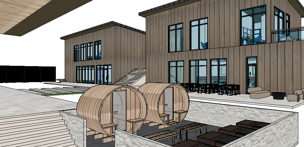 contemporary landscape redesign only keep building exterior unchanged same materials windows doors proportions site located in view royal bc on a gentle slope modern pathway with oversized concrete pavers set in gravel subtle grade transitions with low retaining edges west coast drought tolerant planting lavender sage native ornamental grasses light airy planting composition muted green and grey tones minimal and refined soft natural lighting high realism architectural render