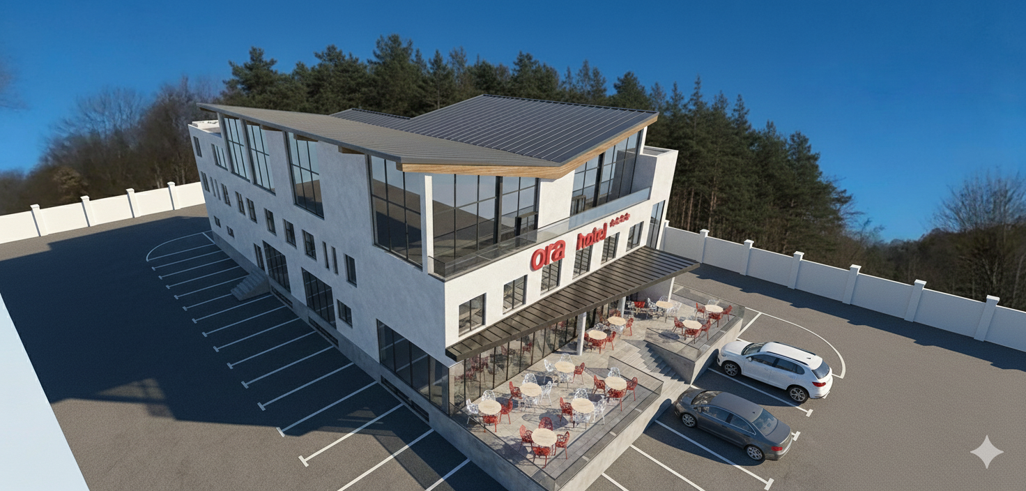 remove the parking on the left side of the image and create a pedestrian corridor to the rear area