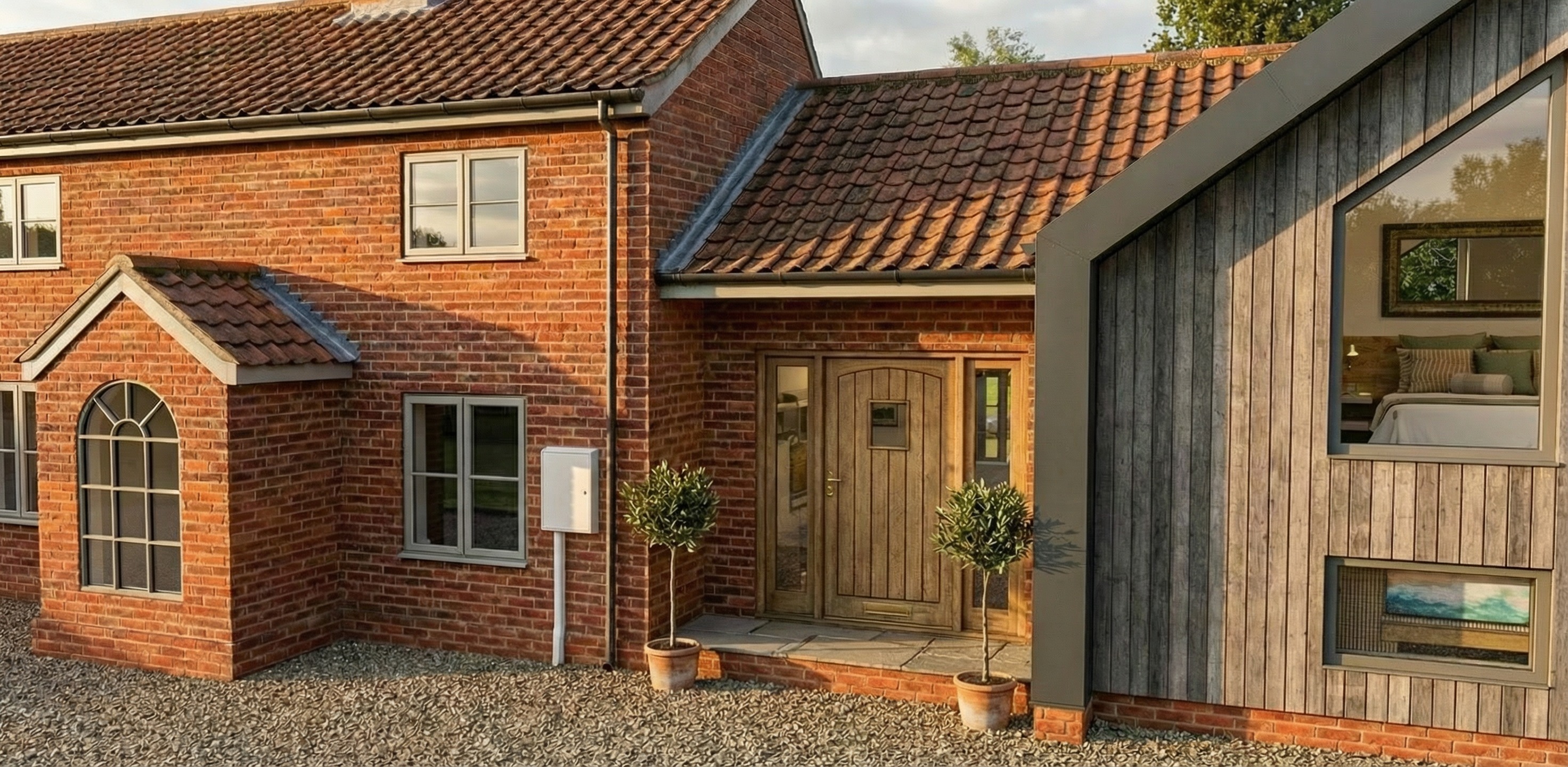 on the red brick house only change the window frames soffit boards drain pipes and guttering to white do not change anything on the barn style extension the wood cladding or the oak vestibule door