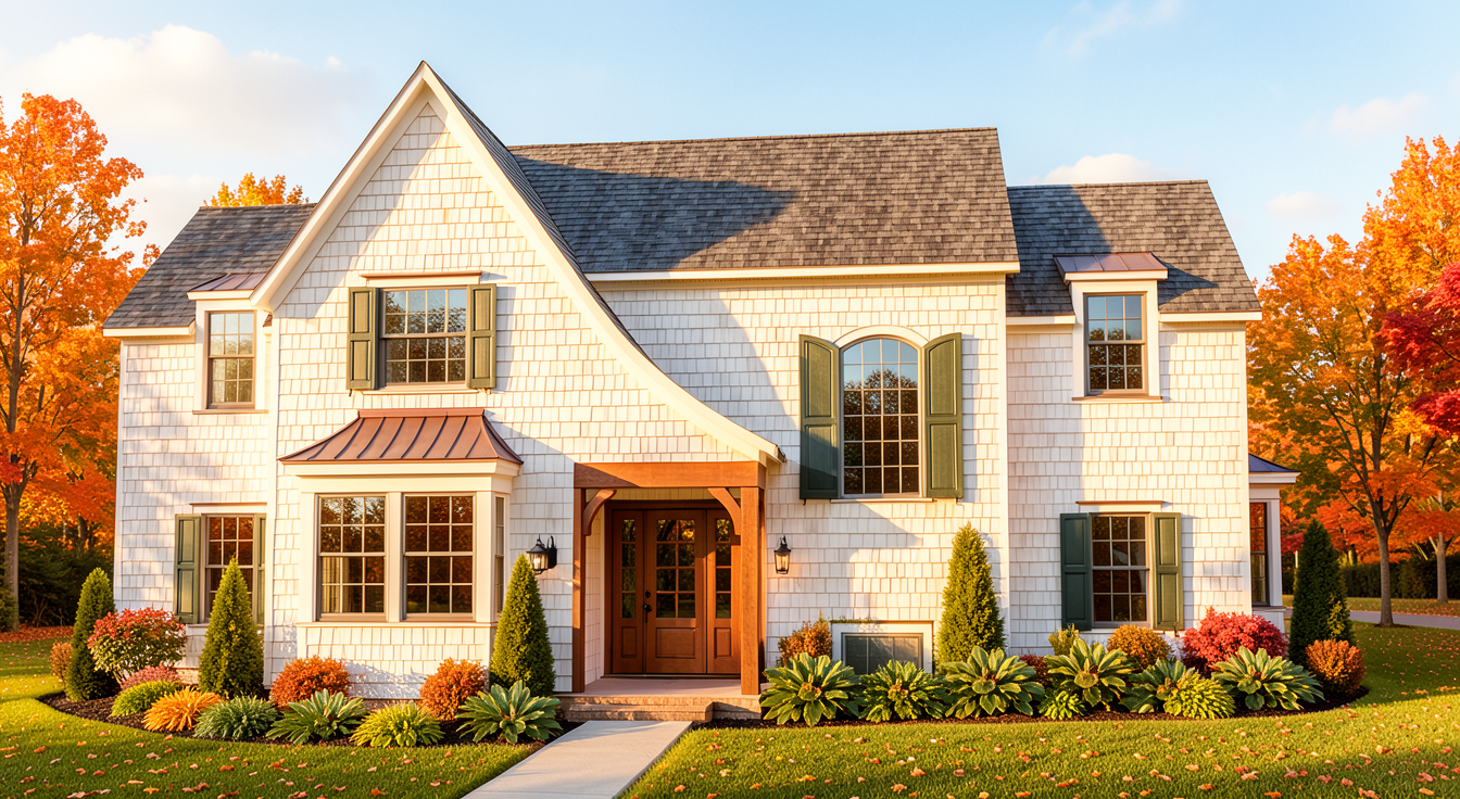 warm fall white shingle siding with full warm bright landscaping