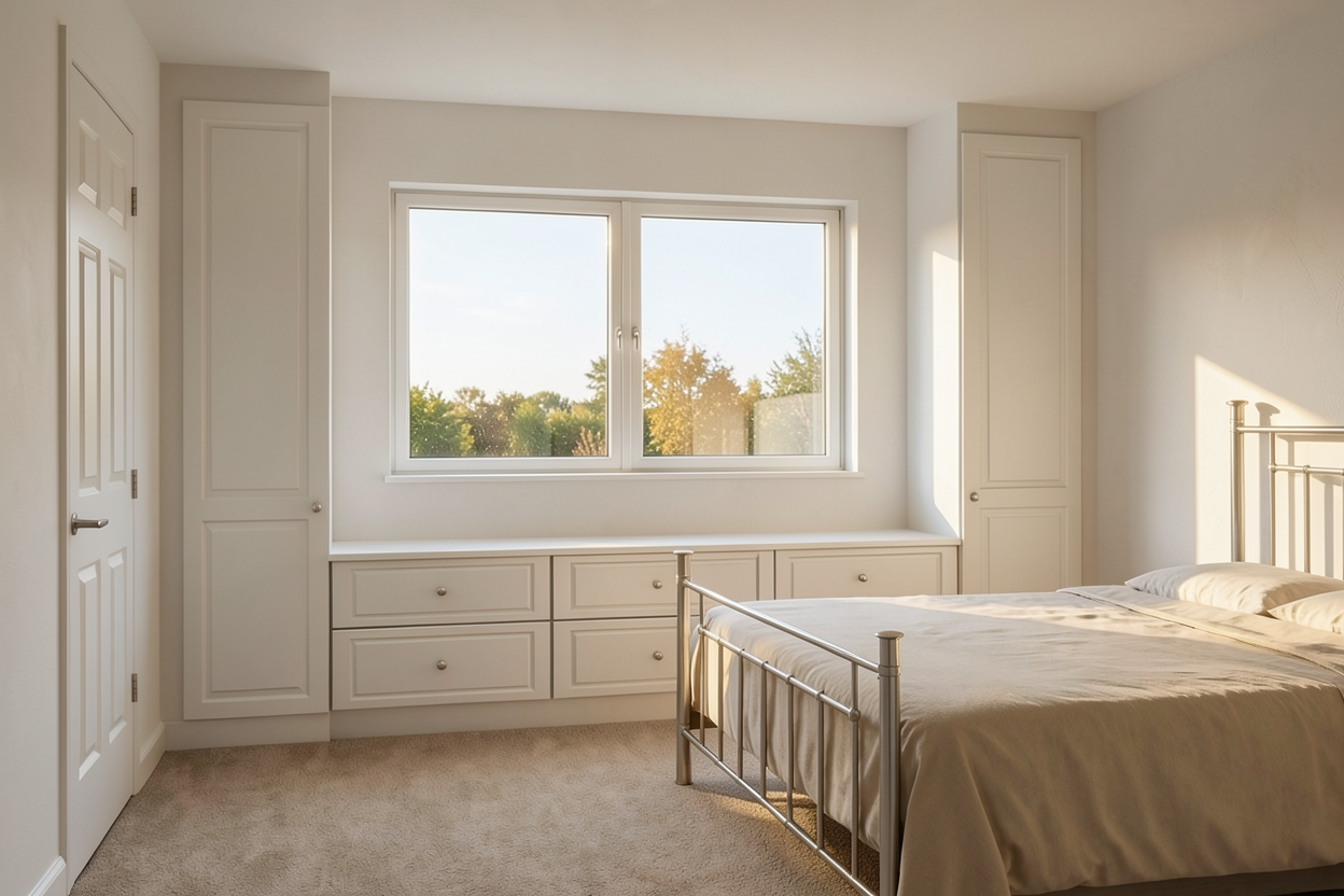 a beautifully rendered image of a modern sideboard with clean lines and a minimalist design the sideboard features a warm walnut wood finish complemented by sleek white cabinet doors illuminate the scene with soft ambient lighting creating a cozy and inviting atmosphere the background is a subtle off white enhancing the stylish simplicity and elegance of the furniture