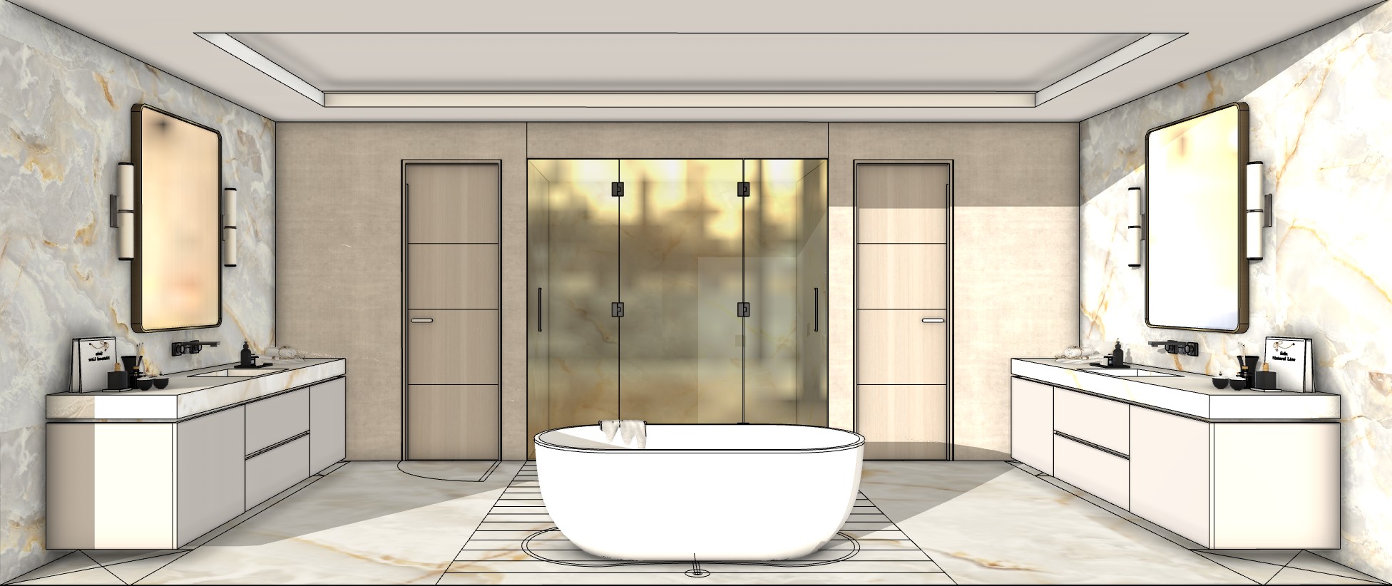 realistic rendering of this sketchup view of a luxury bathroom the wall are all covered by customized miroir the fourniture is made buy metal bronze and calacatta gold marble the finishes of the lights and faucet are gold laiton on the right is a luxury discret switch botton