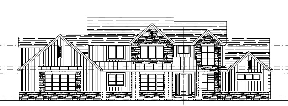 grey rustic stone white vertical siding black roof shingles architecture