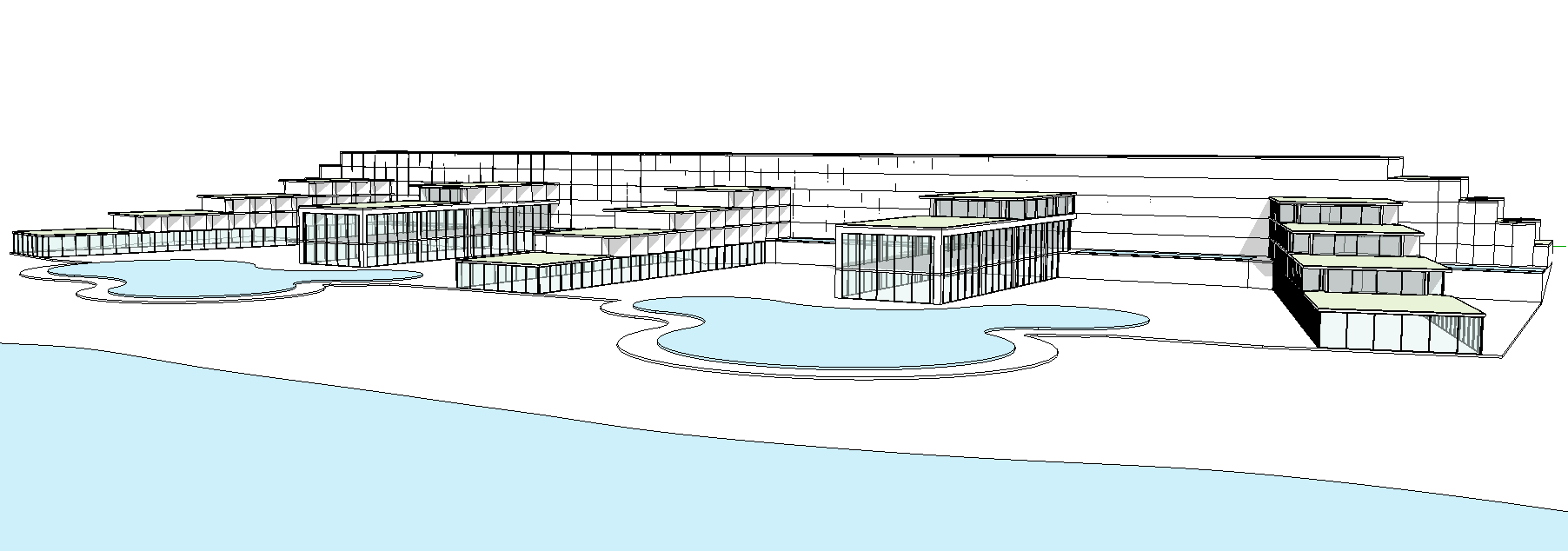 ultra realistic architectural visualization of an existing beachfront resort hotel in cyprus style reference match the visual realism lighting quality color balance and atmosphere of a high end luxury resort render similar to premium mediterranean hotel marketing visuals photorealistic professional architectural render quality corona v ray d5 level architecture strict do not change use the exact provided architecture and geometry do not change building shape massing proportions or layout do not add or remove floors the elongated main building has exactly 5 floors keep all 5 floors total building height is approximately 17 meters terraced balconies remain stepped and unchanged flat roofs with neat controlled greenery and planted areas including the main five storey block no new architectural elements no simplification or reinterpretation scale all elements must respect real world scale building height 17 m people 1 7 1 8 m trees and palms must be proportional and clearly lower than or comparable to the building never oversized no exaggerated vegetation lighting bright sunny mediterranean day clear blue sky strong but soft sunlight high brightness without overexposure no blown highlights no harsh or dramatic shadows clean fresh airy daylight typical for cyprus coastal resorts materials facades light limestone off white concrete warm mediterranean tones terraces and balconies with realistic materials no artificial or oversaturated colors materials must look physically correct and high quality glass reflections realistic architectural glazing glass must show natural reflections of sky sea landscape and surroundings slight transparency with depth not dark or flat no mirror like exaggeration clean premium resort look landscape well maintained mediterranean landscaping green healthy irrigated grass not dry not wild neat planted areas palms shrubs and greenery typical for ayia napa resorts landscape is manicured and designed not natural wilderness no new landscape elements added water pools and sea water must look realistic natural water color gradients soft reflections no artificial cyan or neon tones people few people only realistic scale relaxed resort atmosphere people used only to show scale camera wide architectural view natural perspective no extreme wide angle distortion marketing quality composition color mood natural mediterranean color palette warm but balanced tones no strong artificial saturation no cinematic grading absolute restrictions do not change architecture do not change number of floors do not reduce floors in the long building do not add new volumes or details do not exaggerate vegetation size do not use dark moody or sunset lighting no fantasy elements goal a clean bright ultra realistic luxury resort render that looks like a built project cyprus