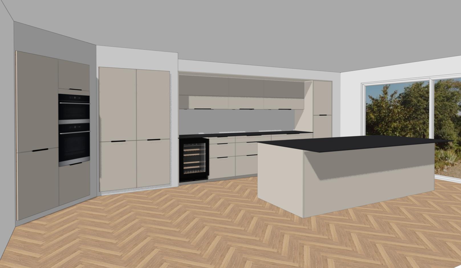 ajoute de l clairage sous les meubles hauts et une lumi re de jour ajoute des tabourets devant l ilot et une table manger moderne en bois rectangulaire sur l espace vide gauche avec de la d coration