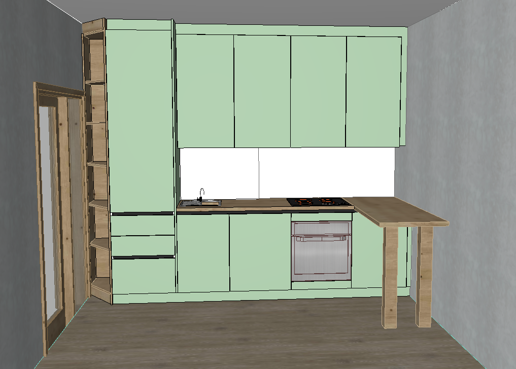 transform this archicad kitchen into a highly realistic photorealistic render while strictly preserving the original layout cabinet design dimensions appliances placement and all architectural details do not redesign do not add new elements and do not change the composition keep everything exactly as modeled only enhance realism the kitchen cabinets should remain a light soft green color elegant and modern preserve the original worktop furniture structure and all details exactly as in the model use realistic pbr materials natural wood or stone textures where already present accurate reflections subtle imperfections soft shadows balanced global illumination and realistic natural daylight maintain clean edges correct proportions and all fine lines from the original project the final result must look like a real photographed kitchen not a cgi redesign not a concept variation and not a different project