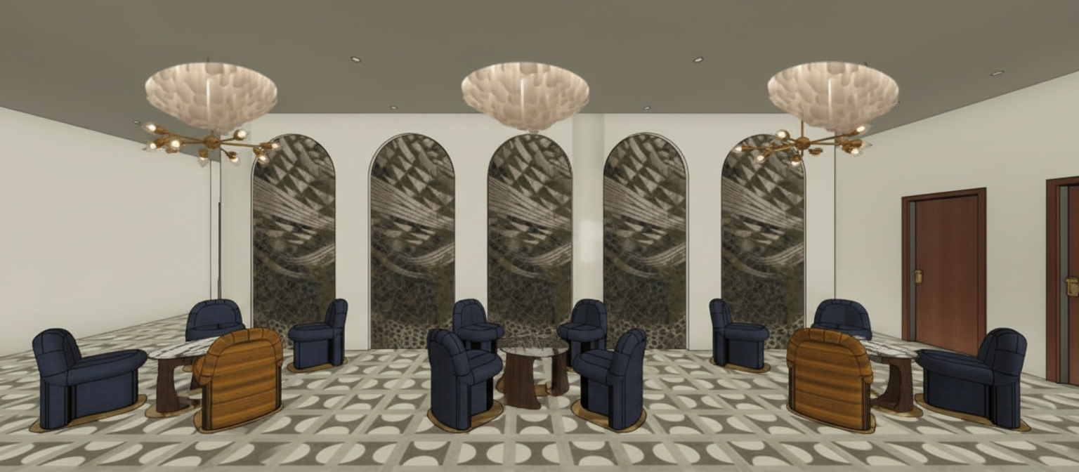 exterior shot hyperrealistic keep the existing flooring exactly as is pattern tone scale keep the existing wallpaper inside the arches exactly as is keep the current furniture layout and seating groupings seating layout important detail maintain the same grouped seating arrangement chairs should stay in intimate circular clusters for conversation spacing should feel balanced and intentional like a lounge setting center tables add add a round wood table in the center of each seating group finish rich walnut or dark stained wood matte or soft satin finish not glossy design clean slightly thick top solid minimal base scale tables proportionally to seating for a grounded look ceiling design focus enhance the ceiling with layered architectural detail add lowered circular ceiling features above each chandelier shape soft round oval recessed drop ceilings aligned with seating zones finish smooth matte plaster in warm off white inside each ceiling drop add a textured sculptural detail like soft carved plaster or radial pattern inspired by the image keep it subtle but dimensional lighting integrate hidden led cove lighting around the inner edge warm glow 2700k creating soft ambient light chandeliers centered within each ceiling feature slightly dropped below the ceiling element for depth overall ceiling should feel layered sculptural and elegant walls outside arches only apply soft textured wall finish fabric like or plaster texture color warm taupe greige keep contrast subtle so arches remain focal furniture fabrics upgrade materials while keeping shapes chairs upholstery in rich fabrics from mood board deep navy textured fabric taupe woven textile muted patterned accents gold blue tones add cushions velvet woven mix colors beige navy warm brown muted gold materials texture language woods walnut dark oak metals brushed brass or bronze fabrics boucle chenille velvet woven avoid flat materials everything should feel tactile lighting warm soft ambient combine chandeliers cove lighting in ceiling subtle recessed lights atmosphere moody warm upscale lounge boutique hotel vibe soft shadows depth contrast minimal decor for realism books small objects render settings ultra realistic materials global illumination ambient occlusion soft shadows eye level camera slight depth of field