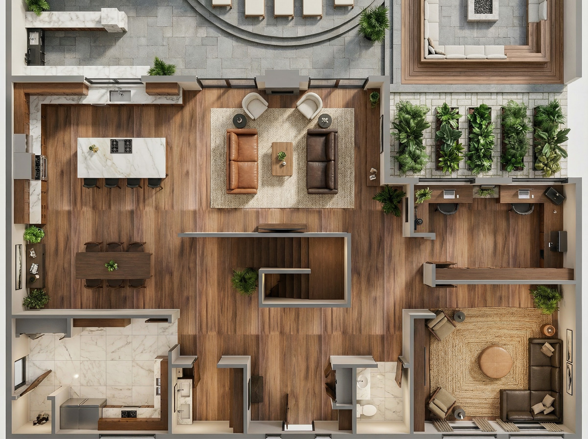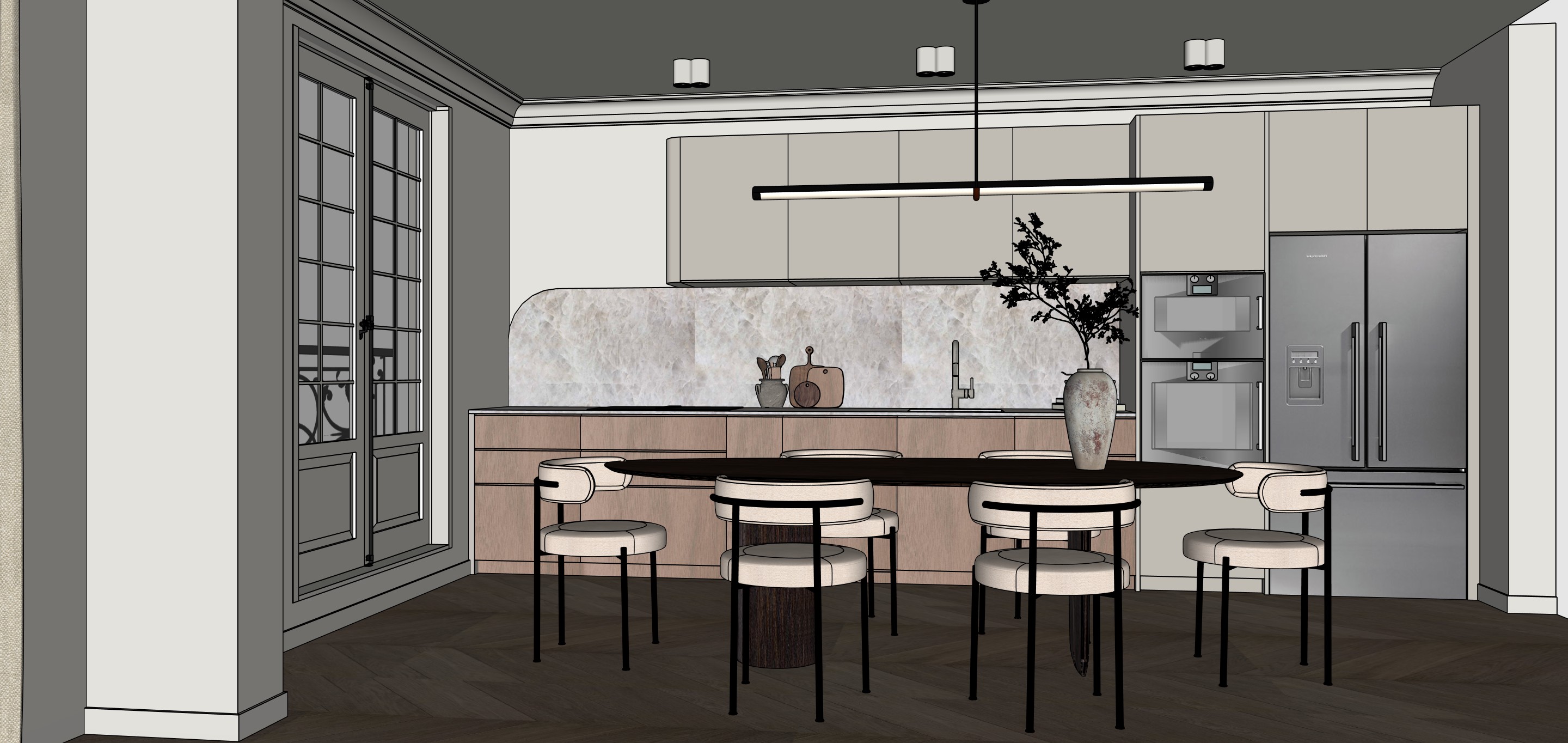 autumn trees and parisian buildings can be seen outside the window and the walls are with light plaster