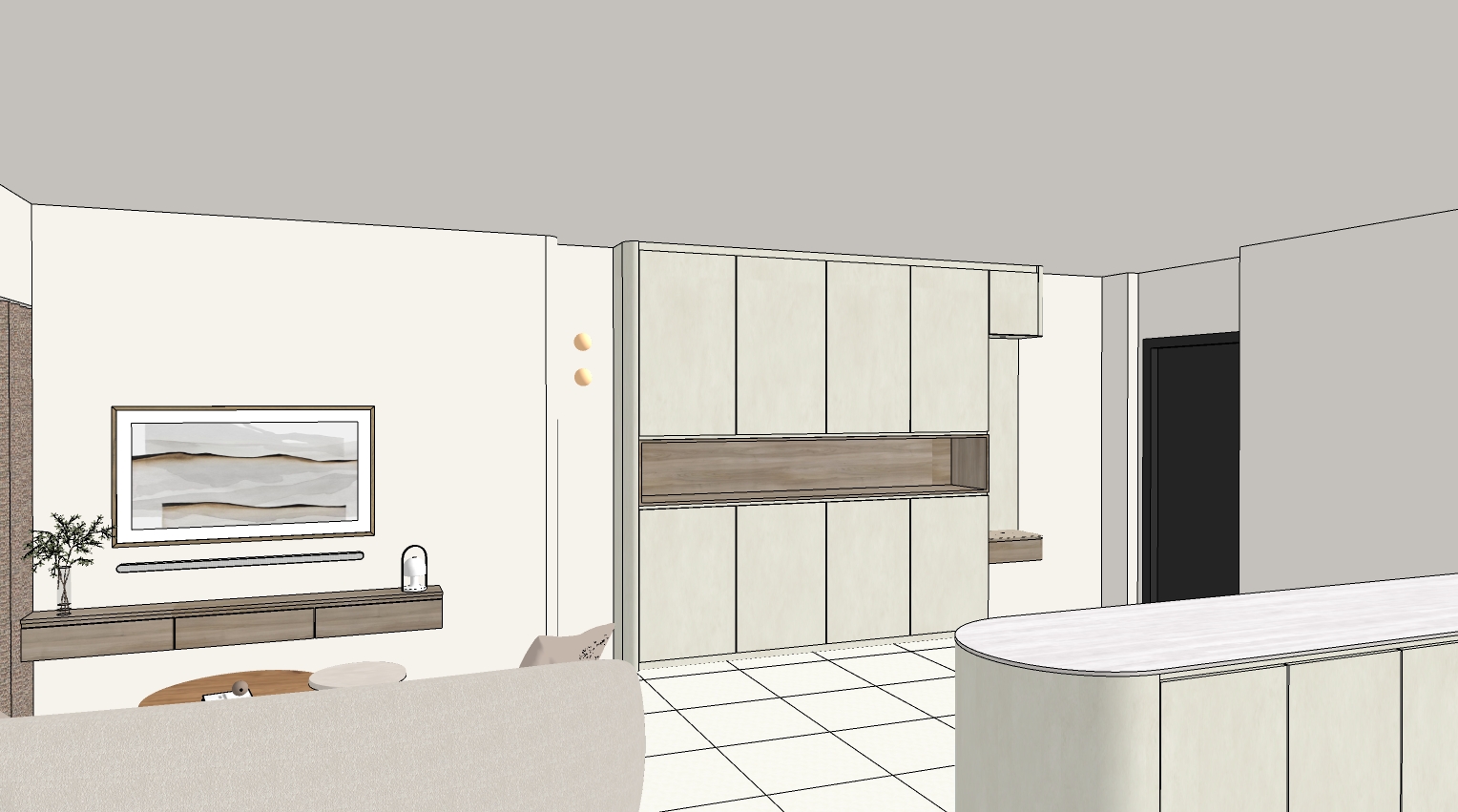 a modern minimalist interior room showcasing elegant and sleek design cream colored walls create a warm inviting atmosphere complemented by a light gray ceiling a wooden door with a rich walnut finish adds contrast and sophistication the wardrobe features a subtle off white shade enhancing the spaciousness a light stone countertop provides a clean workspace with dark shelves creating depth a contemporary chair with a pale beige fabric sits invitingly while sheer white curtains gently soften the ambiance the lighting is soft and ambient creating a calm serene environment