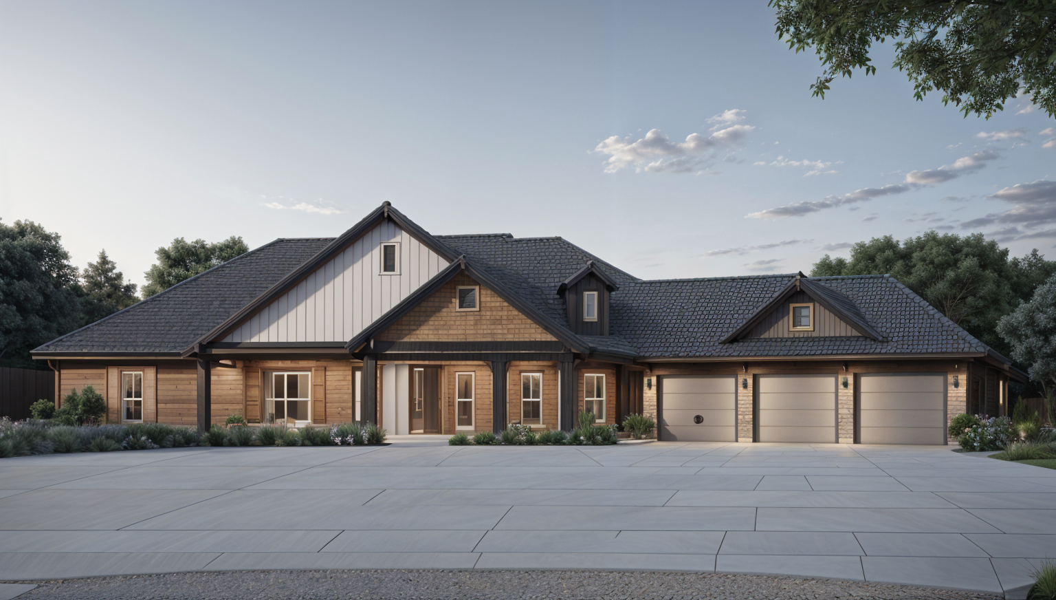 6pm evening a modern two story house with a sleek design and hip roofs featuring a dark gray panels with darker gray trim dark red brick surrounds the entry the roof is a dark charcoal color adding contrast large windows dominate the facade reflecting the clear blue sky the front and garage doors are dark cherry wood surrounding the house a lush green lawn with colorful flower beds in shades of pink lavender and yellow the atmosphere is serene and welcoming with evening sunlight casting gentle shadows do not modify the massing as shown architecture