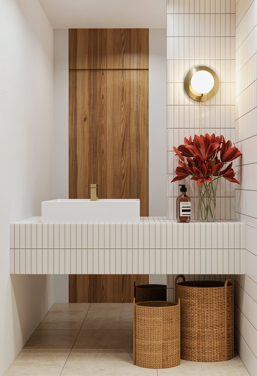 hyperrealistic architectural editorial photograph of a compact bathroom strictly preserving the exact composition camera position framing geometry and all original elements of the reference image absolutely no reinterpretation no additions no removals the mirror must remain exactly where it is with the same size and position the central vertical element is a mirror not a wall or panel extending from the vanity surface upwards it must remain fully present and clearly readable as a reflective surface the mirror reflects a floor to ceiling oak wood door with physically accurate perspective no distortion no exaggeration the reflection must feel natural and consistent with the camera position and scene geometry the oak door in the reflection has highly realistic materiality visible grain subtle tonal variation soft imperfections and a satin finish with controlled reflectivity never glossy the floor is large format beige porcelain tile rectified with extremely thin and nearly imperceptible joints matte finish and soft diffuse reflectivity slight tonal variation between tiles to avoid flatness the left wall and ceiling are finished in smooth white paint with very fine micro texture matte softly absorbing light without appearing flat or synthetic the right wall and the entire vanity structure front and top are clad in small format vertical ceramic tiles exactly matching the original layout tiles have subtle volumetric relief clearly defined but ally integrated joints and a matte finish that gently catches light on edges enhancing depth the sink is white porcelain with a smooth slightly satin surface soft reflections and realistic edge thickness no deformation or redesign the faucet and wall light aplique are brushed gold warm metallic tone subtle micro scratches and controlled soft reflections not mirror like the wicker baskets below the vanity are natural fiber with clearly defined woven texture slight irregularities and warm tonal variation they cast soft detailed micro shadows the glass vase is transparent with realistic thickness and refraction the flowers red lilies have delicate petal translucency subtle imperfections and natural gradients lighting is soft warm and diffused slightly directional enhancing volume and texture without harsh contrast the atmosphere should feel calm intimate and editorial with strong emphasis on material realism and depth ultra realistic rendering physically accurate materials soft global illumination no over sharpening no stylization