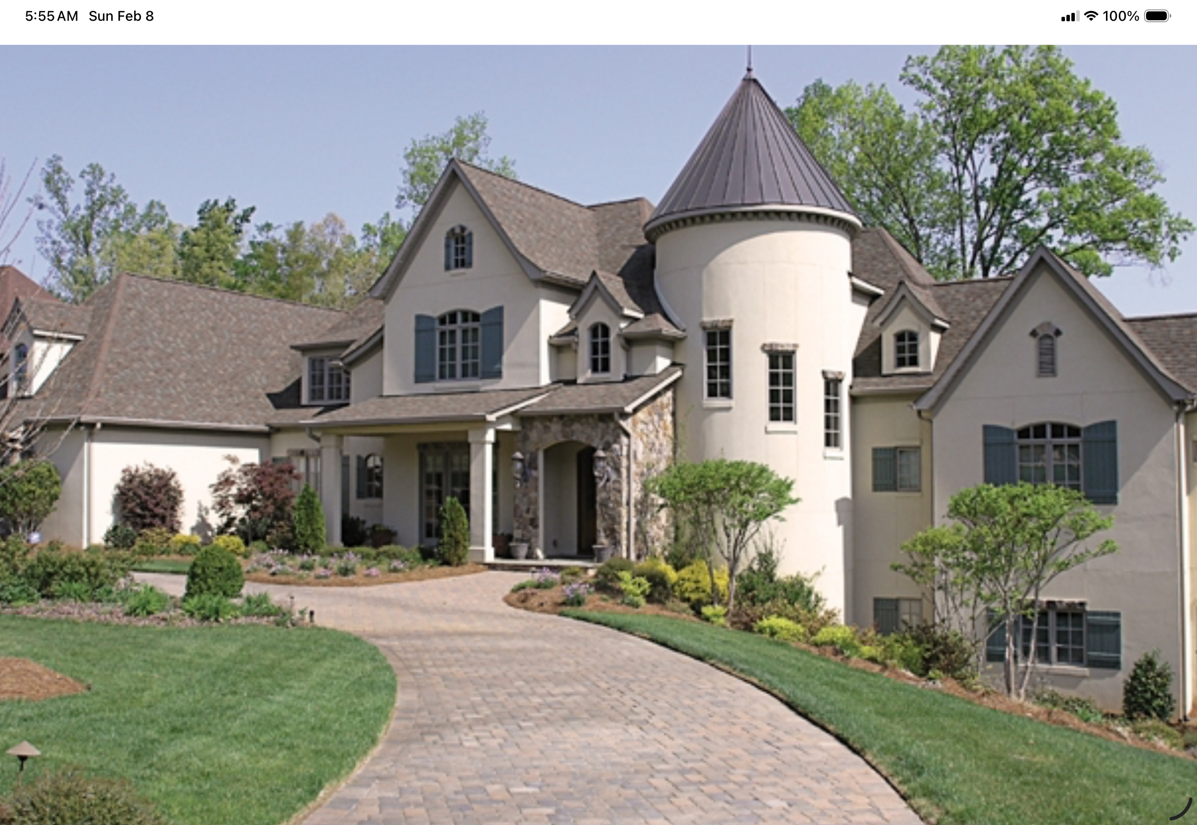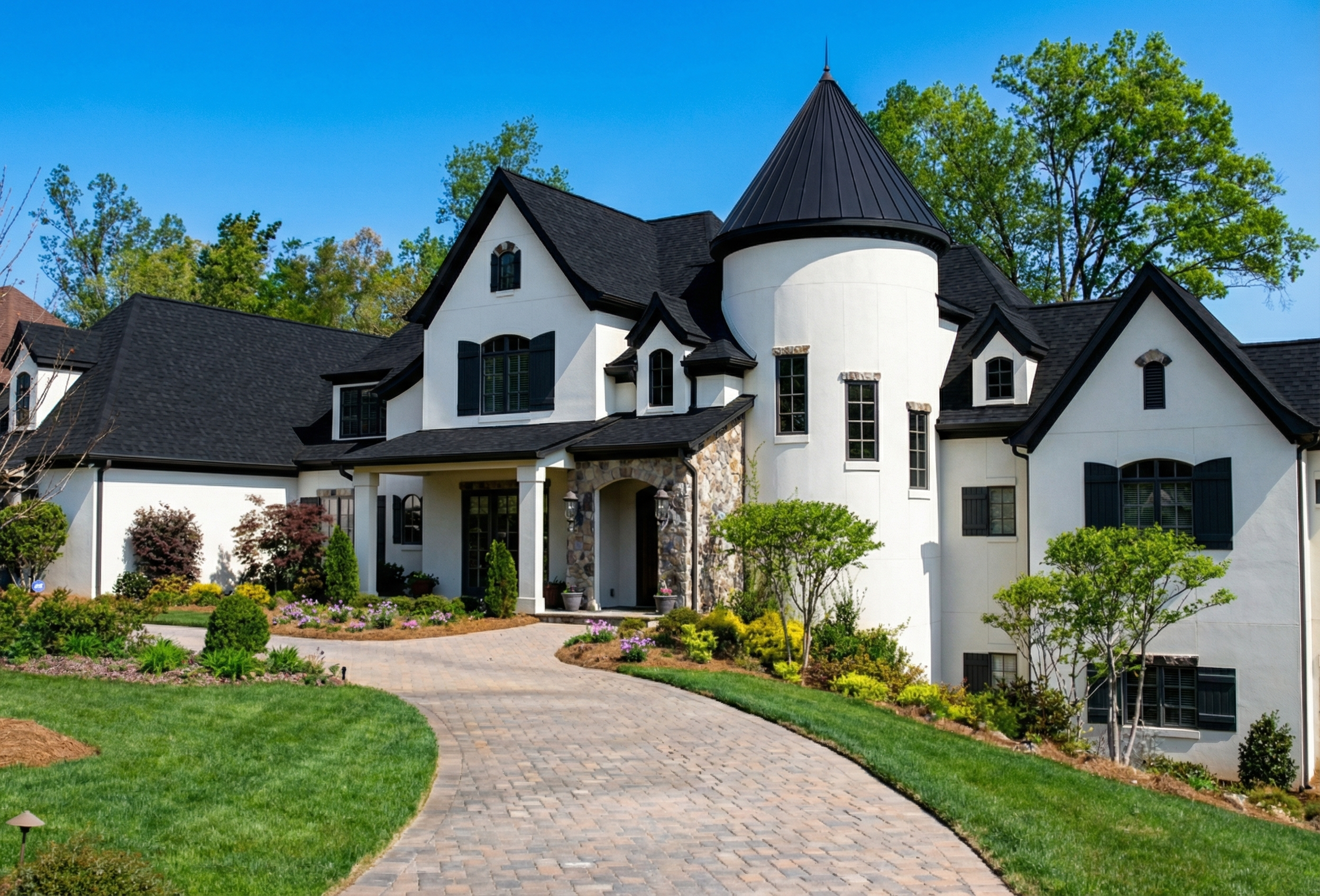change roof windows and eaves to black white stucco lush landscaping and vivid blue sky