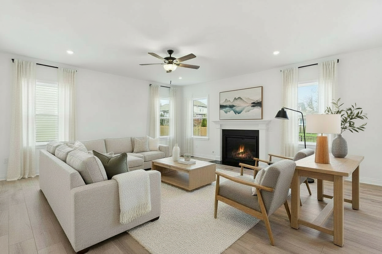 move the table that is behind the chairs to the back wall between the windows change the ceiling fan to a modern gold farmhouse chandelier