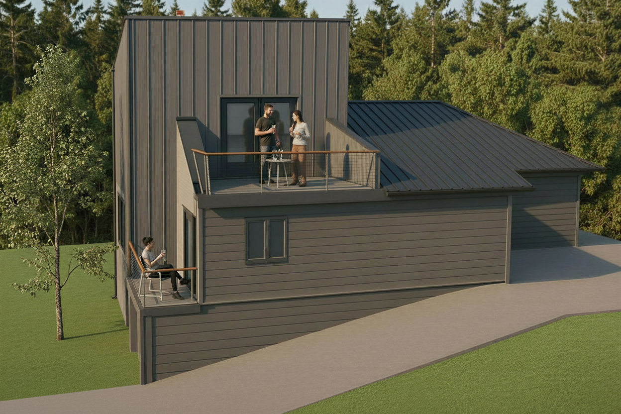 dark charcoal gray vertical siding lighter horizontal siding widen driveway width a bit on left side