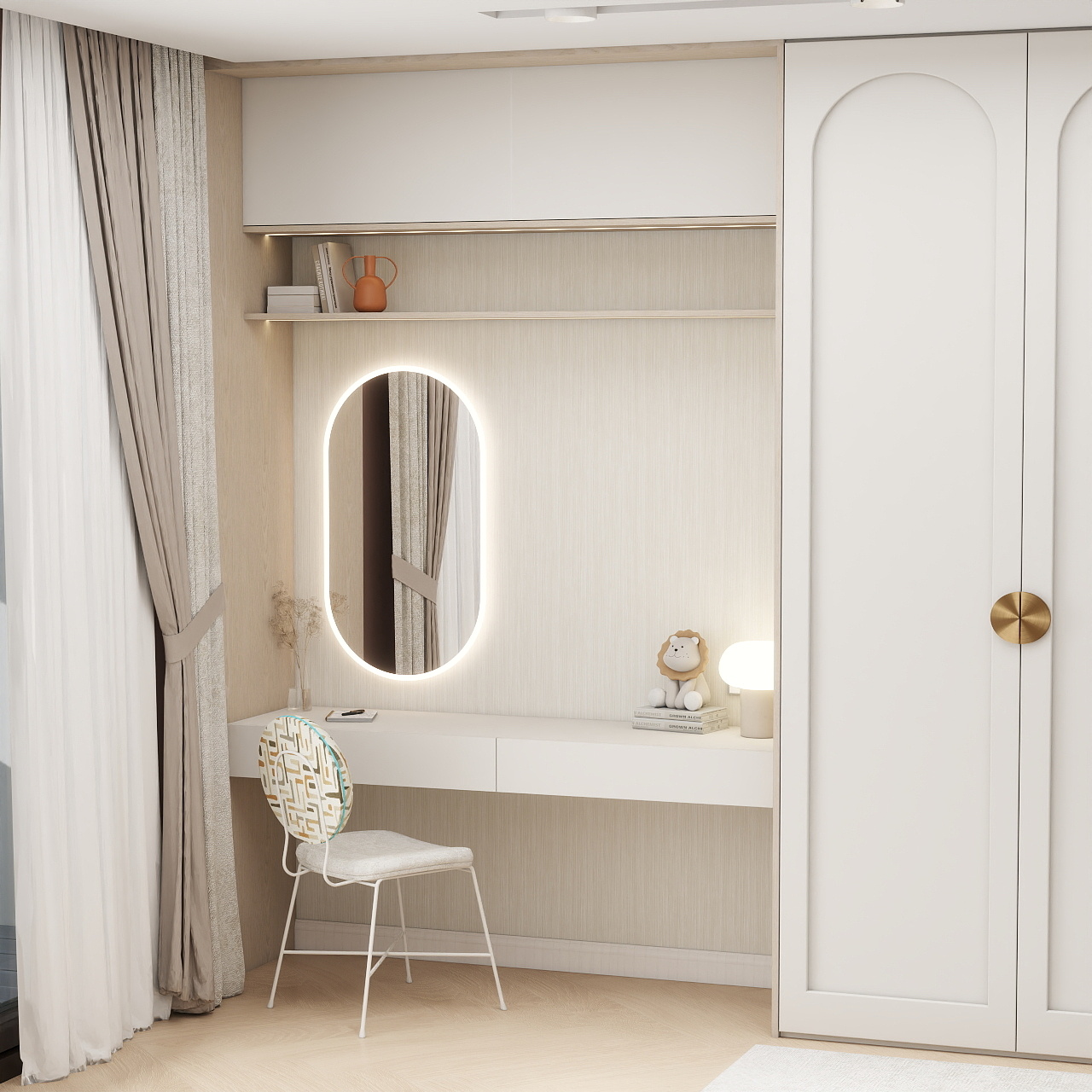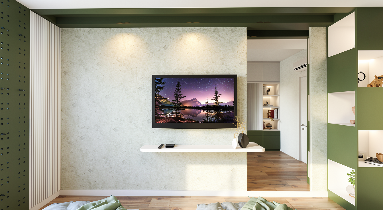transform the provided interior image into a high end photorealistic render with warm golden hour atmosphere soft glowing highlights and relaxed upscale energy while keeping everything exactly the same same proportions same colors same floor same wood same furniture same lights keep the led lights in the same position every light source should be 3000k warm light make it with contrast and dramatic effect and luxury looking add horizontal leds beneath every shelf do not add anything else