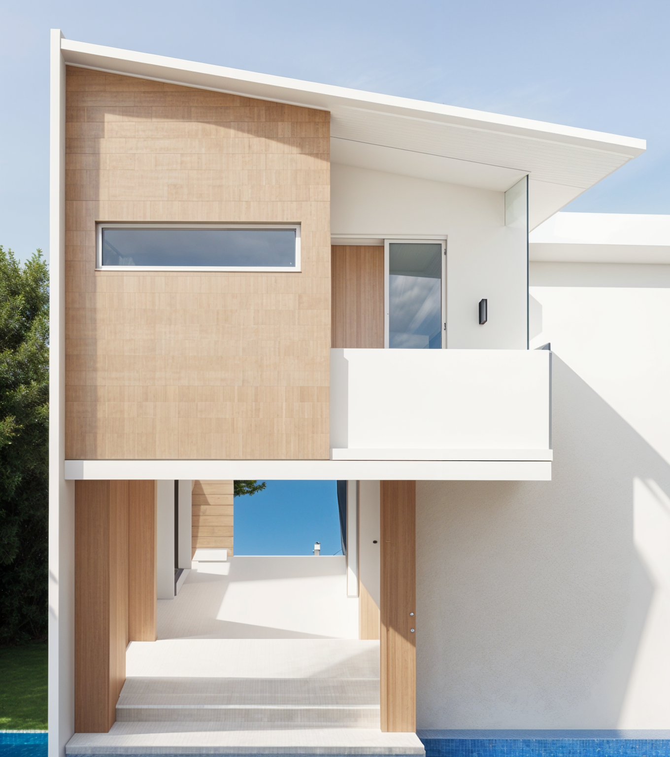 render a modern stilt house with a sloped roof and a beige exterior wall featuring horizontal dark brown tones the balcony is light brown color the window frames are dark brown providing contrast against the reflective glass the stilts are pure white supporting a black staircase leading upwards the backdrop is an expansive clear blue sky the atmosphere is tranquil with soft natural lighting enhancing the warm earthy colors of the structure
