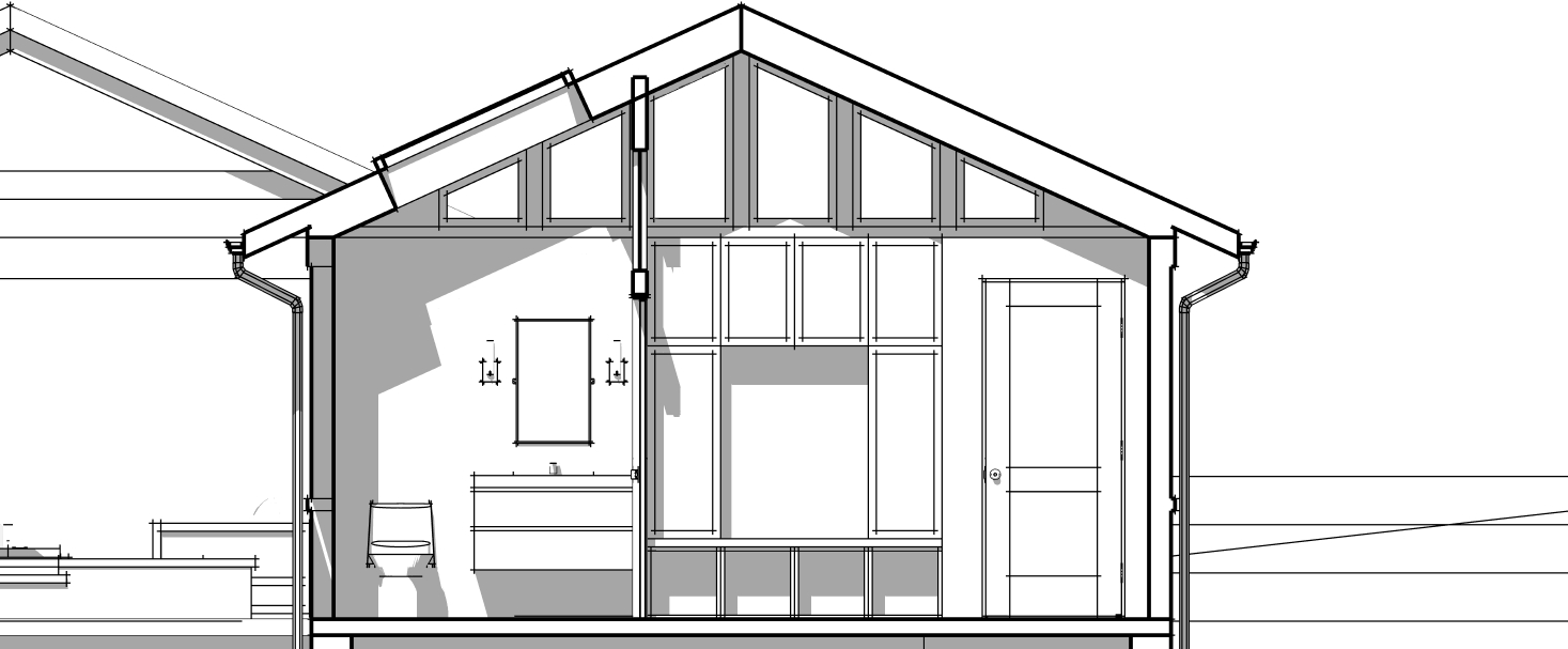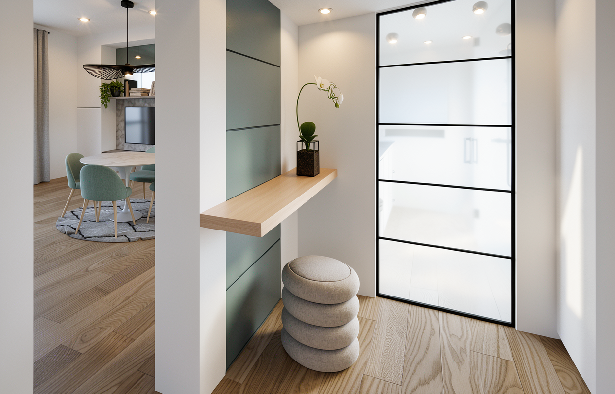 a modern minimalist bathroom design large beige tile flooring complements a light wood grained vanity and a cabinet with brass handles a glass shower enclosure with elegant brass fittings completes the design the atmosphere is calm and relaxing accented by lush green plants hanging in black pots the lighting is soft and natural creating a relaxing spa like atmosphere the mirror is backlit the shower alcove with four shelves is illuminated from top to bottom by an led strip the fixtures are brushed copper the mirror reflects the smooth frameless white door