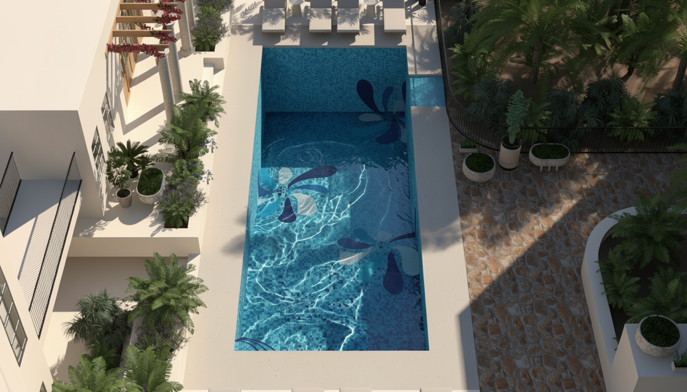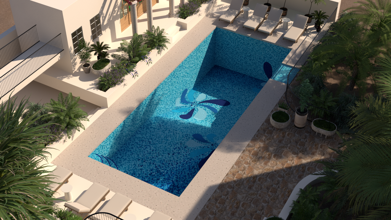 please enhance this architectural pool rendering with a photorealistic approach while maintaining all existing design elements specifically 1 water rendering replace the current pool surface with crystal clear photorealistic water apply realistic light refraction and caustic effects to showcase the pool s mosaic floor design ensure water transparency allows complete visibility of the irregular mosaic flower pattern at the pool bottom without any modifications to the existing design 2 material texture preservation keep all current colors textures and geometric forms intact ensure the irregular mosaic flower pattern which is an integral part of the pool design remains unaltered and properly visible through the transparent water 3 lighting enhancement implement advanced photorealistic lighting with improved natural daylight simulation with realistic sun positioning and soft shadows enhanced ambient occlusion for depth and dimensionality realistic reflection and refraction on all water surfaces subtle caustic light patterns that reveal the pool s mosaic design without overshadowing the architectural composition color temperature correction for warm inviting natural light 4 overall visual polish achieve a photorealistic aesthetic across all elements architecture materials landscape and water while maintaining the design intent and color harmony of the original visualization
