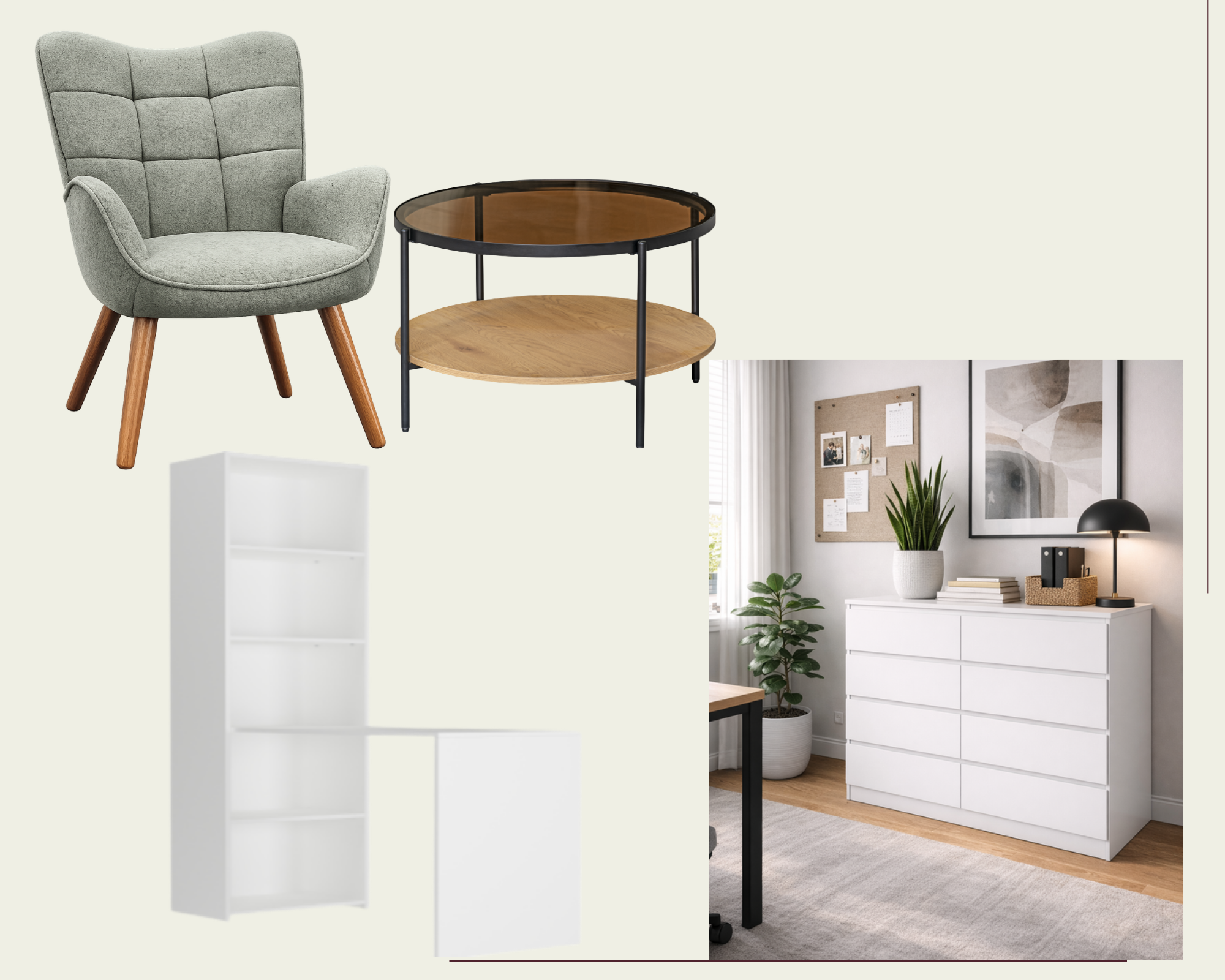 create a photorealistic interior of a modern minimalist home office combined with a small living space based strictly on the provided moodboard important all furniture must match the moodboard products exactly shape proportions colors materials do not redesign or reinterpret them don t replace the desk with the shelf the desk comes with the shelf as in the picture the desk top is the same width as the shelf
