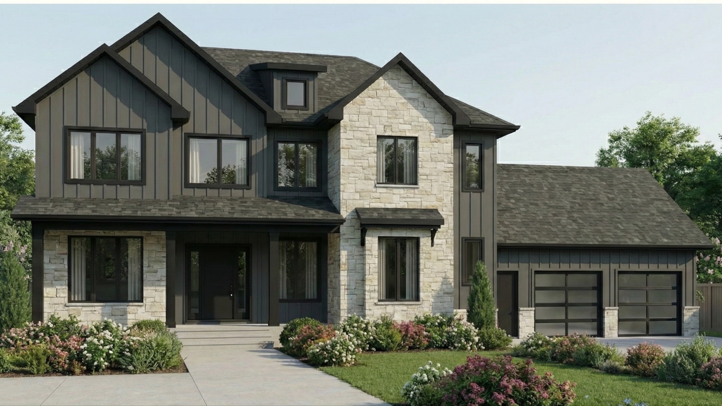 create a realistic photo of this house only change the roofline over the front door to a black metal roof