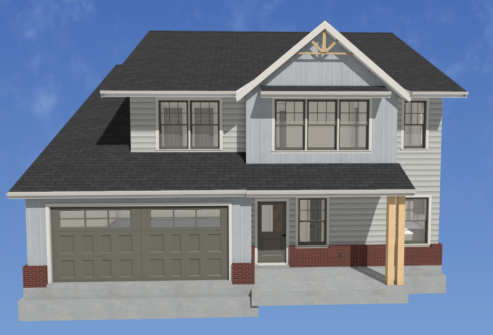 add a driveway in front of the garage door add landscaping around the front porch and a landscaped background make the siding and trim white porch post and gable accent light stain