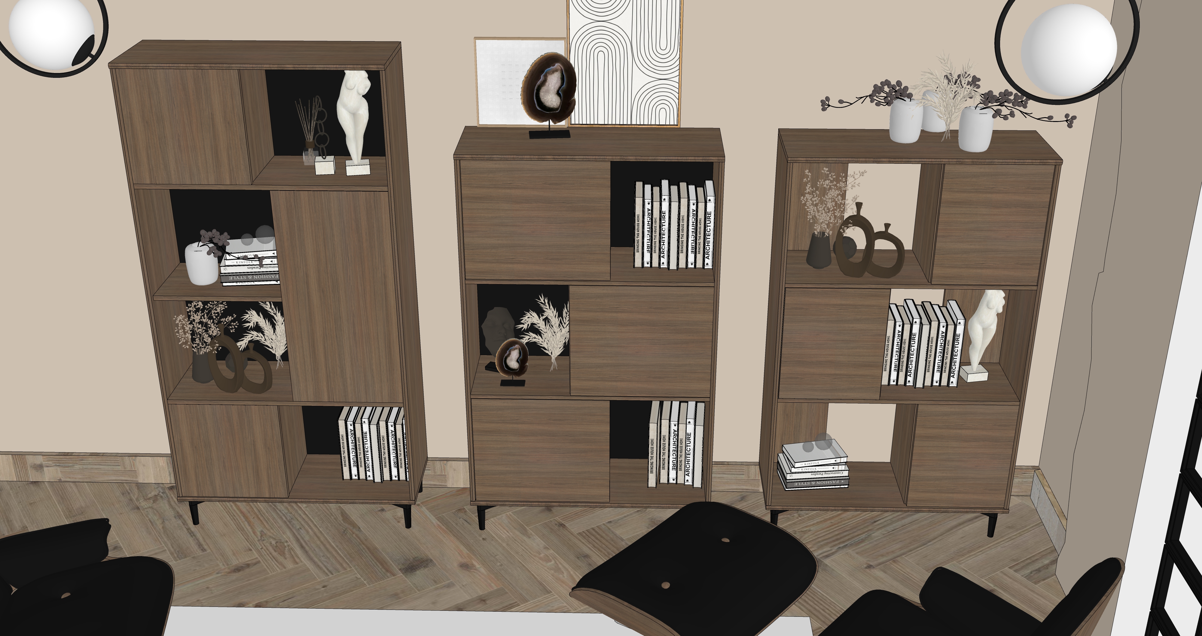 int rieur au design moderne et naturel salon haut de gamme avec un mur beige avec texture argile mobilier minimaliste en mat riaux art d co fauteuil eames en noyer et dessus cuir noir satin coussins beige lumi re naturelle douce entrant par de grandes baies vitr es en m tal noir du sol au plafond situ es droite cr ant des ombres subtiles et une illumination quilibr e lampe sur la droite pendant du plafond en verre fum clair finition satin pour les meubles ajoute des bouquets de plante s cher dans des pots de terre cuite blanc beige gris de forme art deco un tapis au sol en laine bouclette sur le sol en bois ch ne clair chevron textures ultra d taill es rendu photor aliste r solution 8k mat riaux ultra pr cis clairage physique r aliste palette de tons chauds ambiance contemporaine et sereine