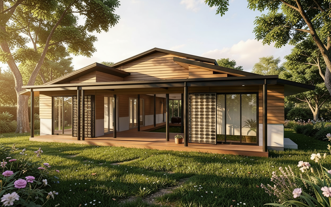 contemporary tropical minimalist house identical to the reference image preserving exact composition proportions camera angle perspective scenario and interior do not modify the architectural layout materials or interior design modify only the inclination of the upper roof adjusting its slope while maintaining the original position and proportions keep the upper roof fa ade finished in wood preserving its materiality and appearance do not introduce new materials or alter the fa ade design all other elements remain unchanged including natural wood cladding exposed concrete base matte black volumes round black columns wooden deck and surrounding tropical vegetation soft natural daylight warm tones realistic shadows calm atmosphere ultra realistic architectural render highly detailed materials 4k cinematic composition no people