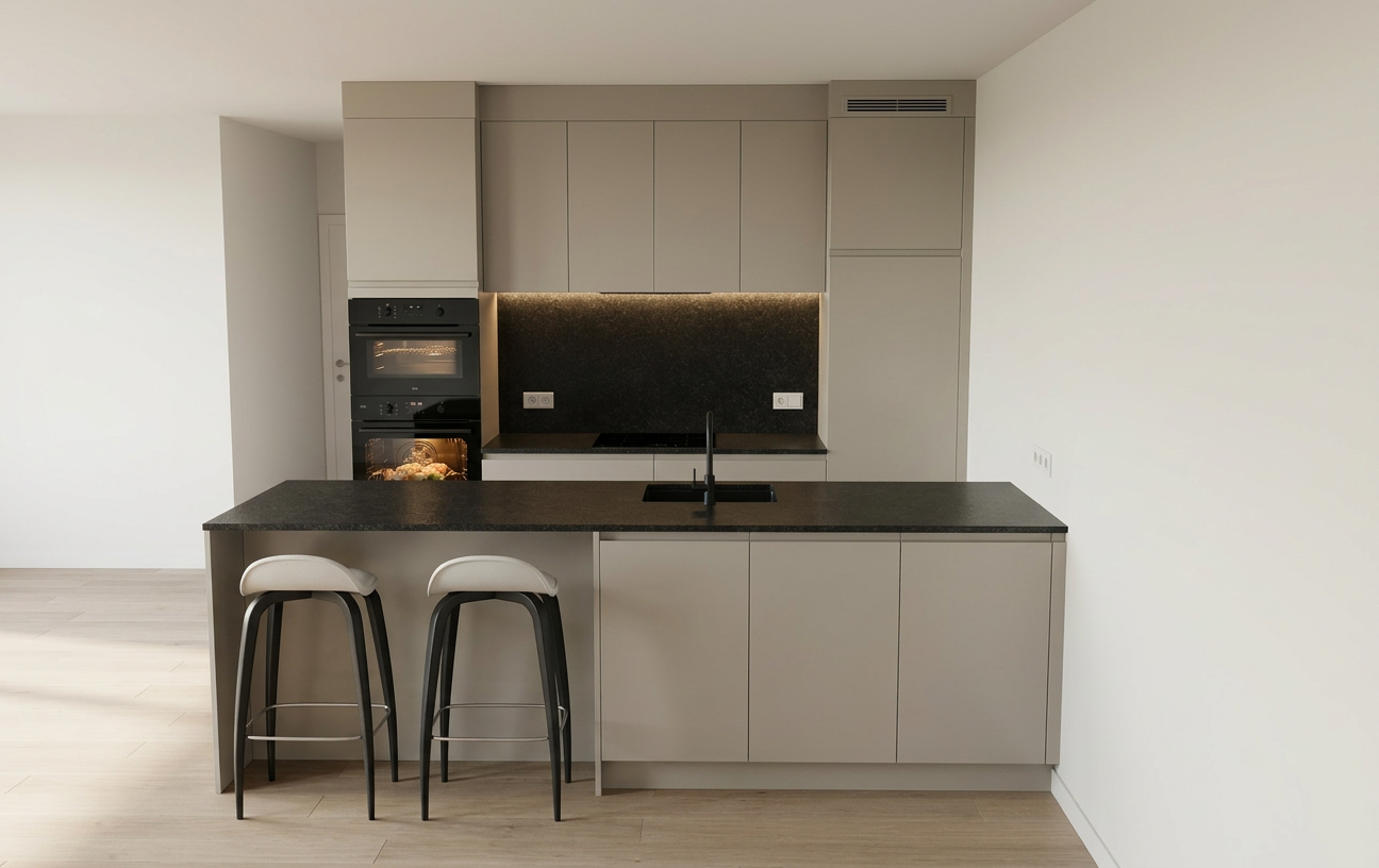 please keep the geometry of all furniture and lighting fixtures unchanged the flooring should be a dark brown matte chevron parquet the legs of the two armchairs and the sofa should be dark wood the dining chairs remain light beige the walls should be light beige with 10 cm baseboards and 10 cm ceiling moldings throughout the kitchen cabinetry should be a rich burgundy while the fronts of the shallower cabinets should be dark brown wood the pendant lights should be matte gold place a large sheer curtain in front of the windows place a large artwork between the two windows featuring beige burgundy and brown tones in the kitchen add a few recessed spotlights to the ceiling