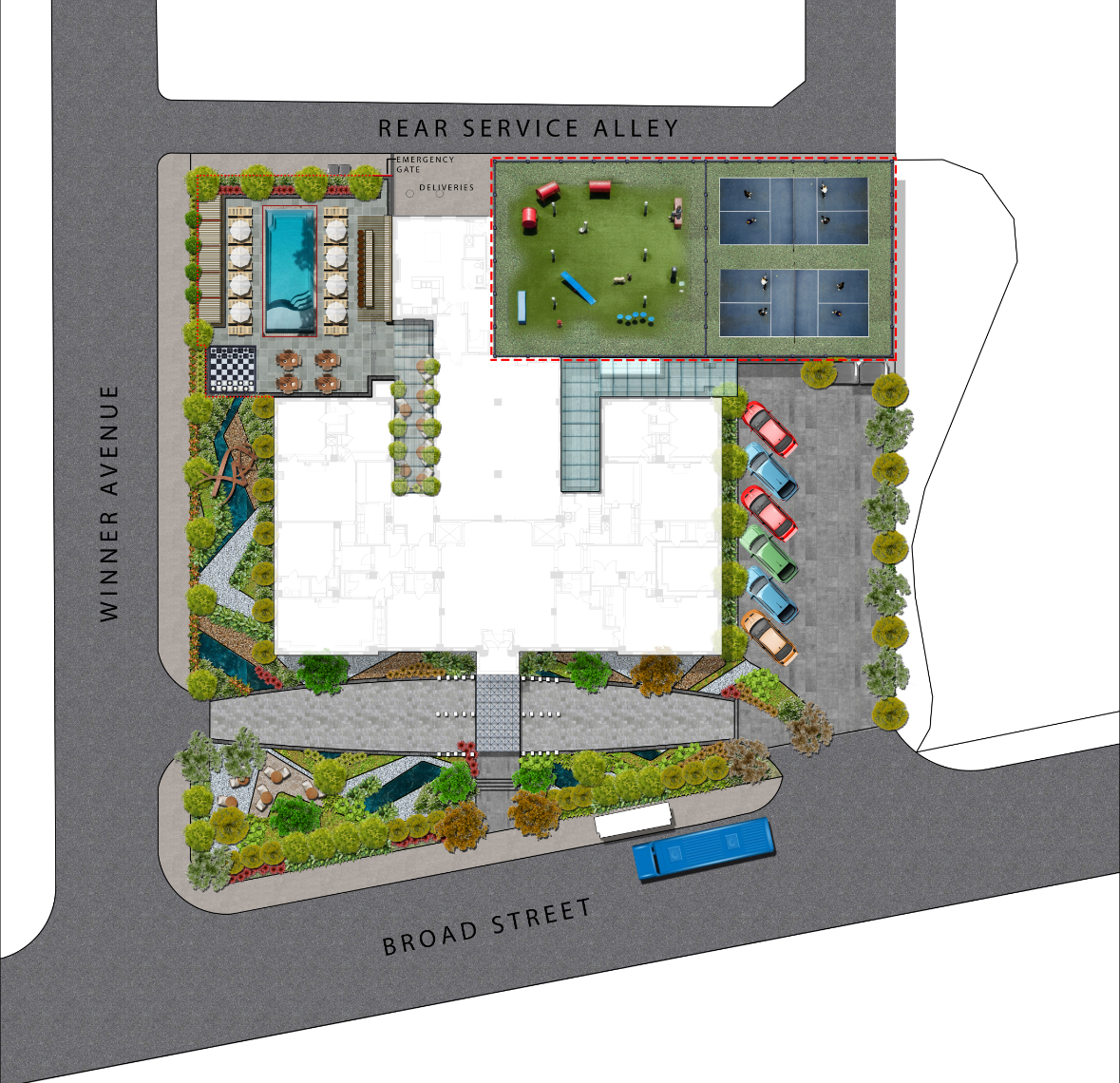 this a landscape site plan please make it look photorealistic leave the white building area alone