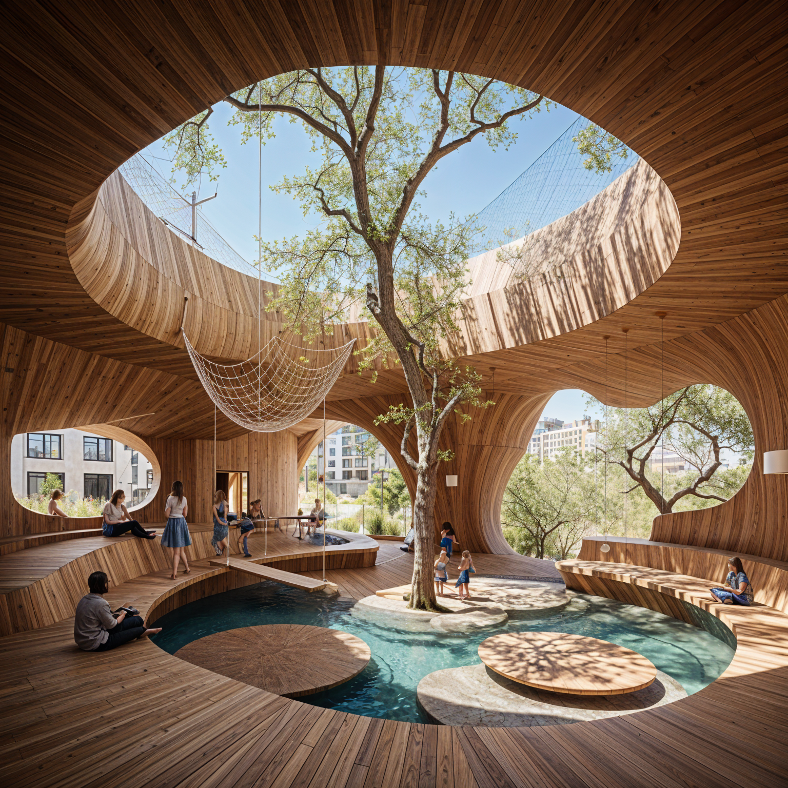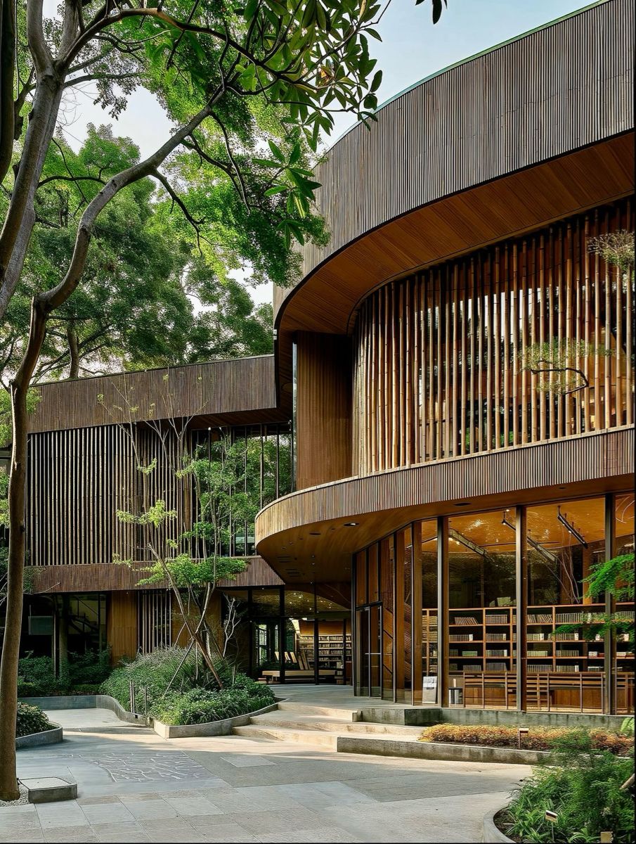 sarineen exterior shot make it designed with more curvy line modern wood nature concept with open spaces add more greenery make it less complex remove a few of the walls to open area architecture