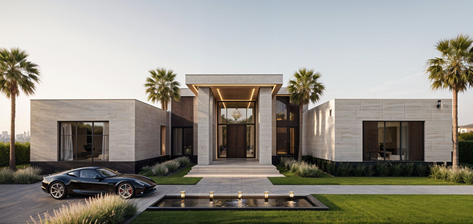 exterior walls are light gray stucco there is a stucco chamfered bay window on the ground floor the upper floor is grey vertical board and batten siding there is brick siding at the base the entrance porch is white painted wood