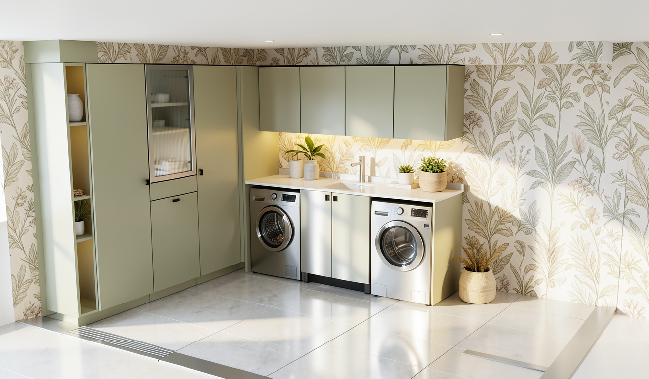 tienes que poner papel pintado para cuarto de lavado decorativo quita papel pintado poner papel pintado tipo vegetal tonos claros poner decoracion quiero que las puertas todas tengan el mismo color quiero que el cristal de la vitrina sea mate quita decoracion y pon tabla de de plancha cambia el color de todos los muebles a mas claros quita reflejos y baja intensidad de la luz natural quita la mesa quita objetos decorativos de dentro de los muebles baja la intensidad de la luz natural quita baldas del mueble que no tiene puertas cambia el cristal de la vitrina para que no se vea el interior quita la decoracion del mueble vitrina cambia el color de la lavadora y secadora y ponlo en acero inox cambia la iluminaci n de la cocina para que sea luz natural mas y sin reflejo y pon decoracion moderna y grifo centrado con fregadero baja la intensidad de luz debajo de los muebles altos
