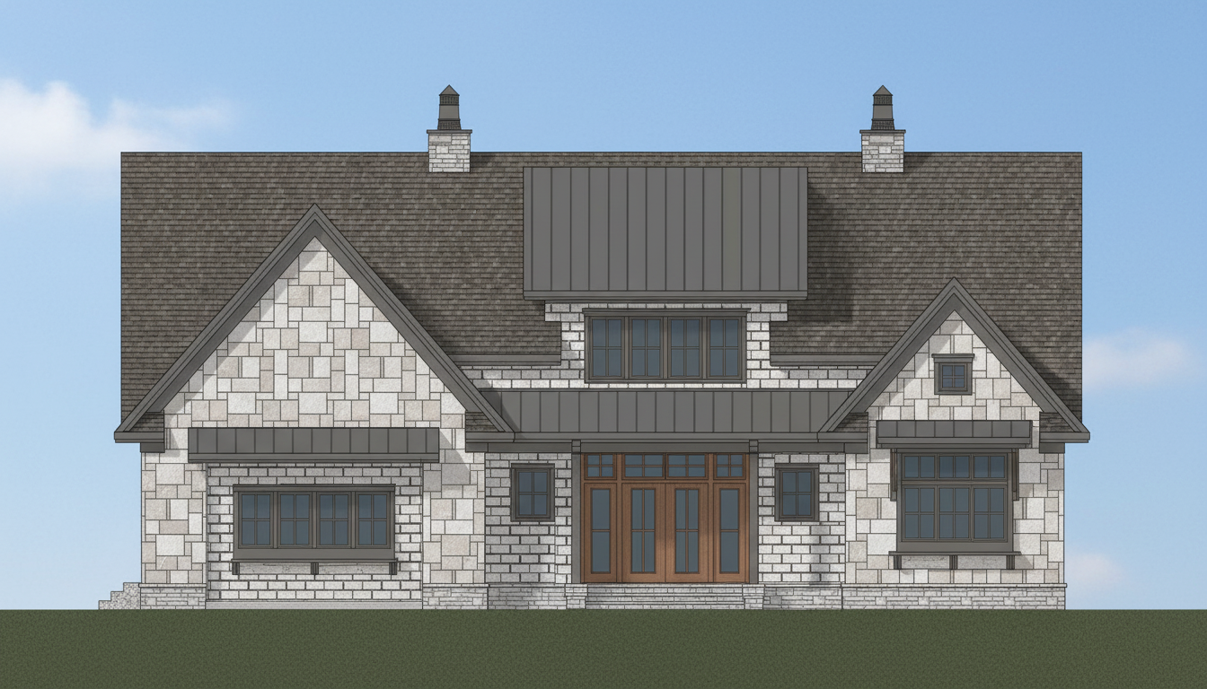 off white brick and stone with bronze metal accent medium cool wood front door and columns spring landscape