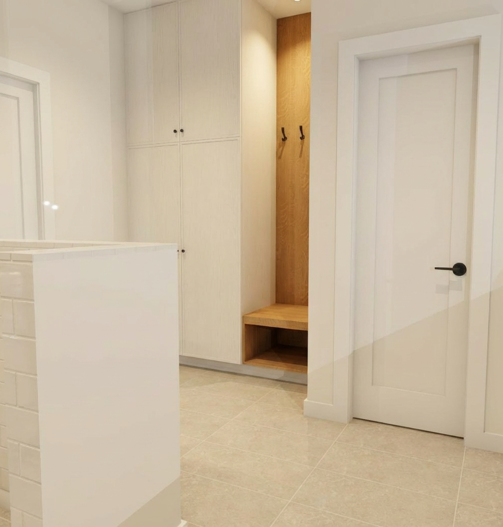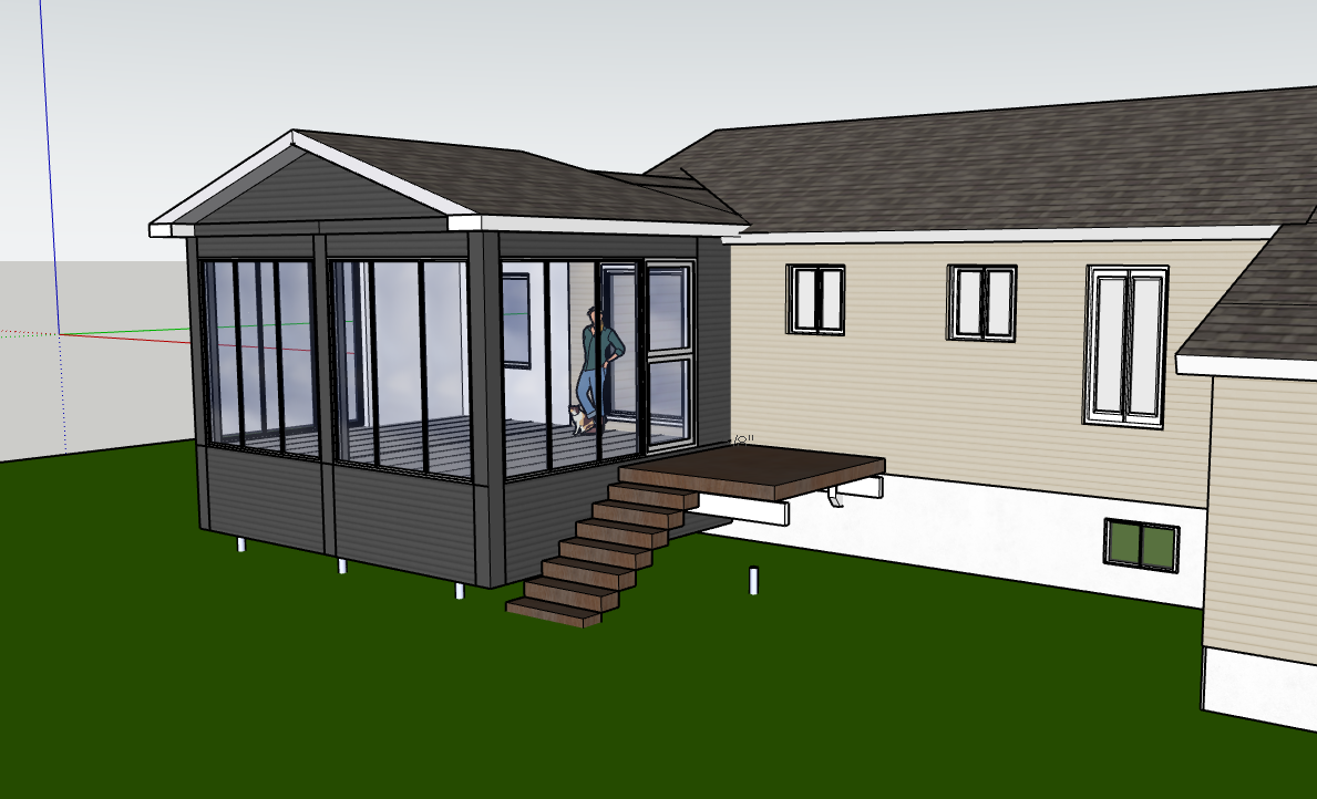 add a street behind the house there are no neighbors on the sides there are trees to the right of the house set the sunlight to 2 pm no sunbeams a few clouds do not add trees in front of the house respect the building s shape and the chosen siding colors the windows are aluminum colored there is no street in front of the house make the left side of the siding charcoal gray and the right side beige