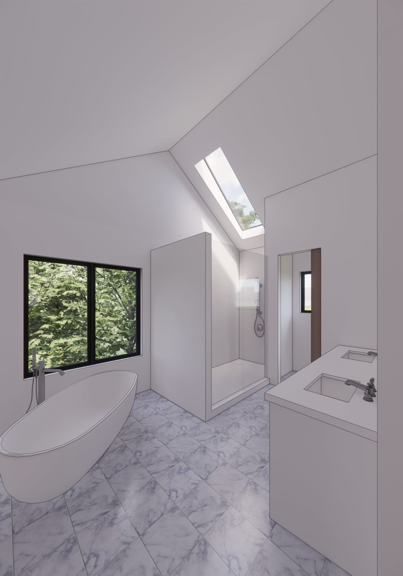 create photrealistic image with tile and realistic materiality of a bathroom add wood paneling on ceiling
