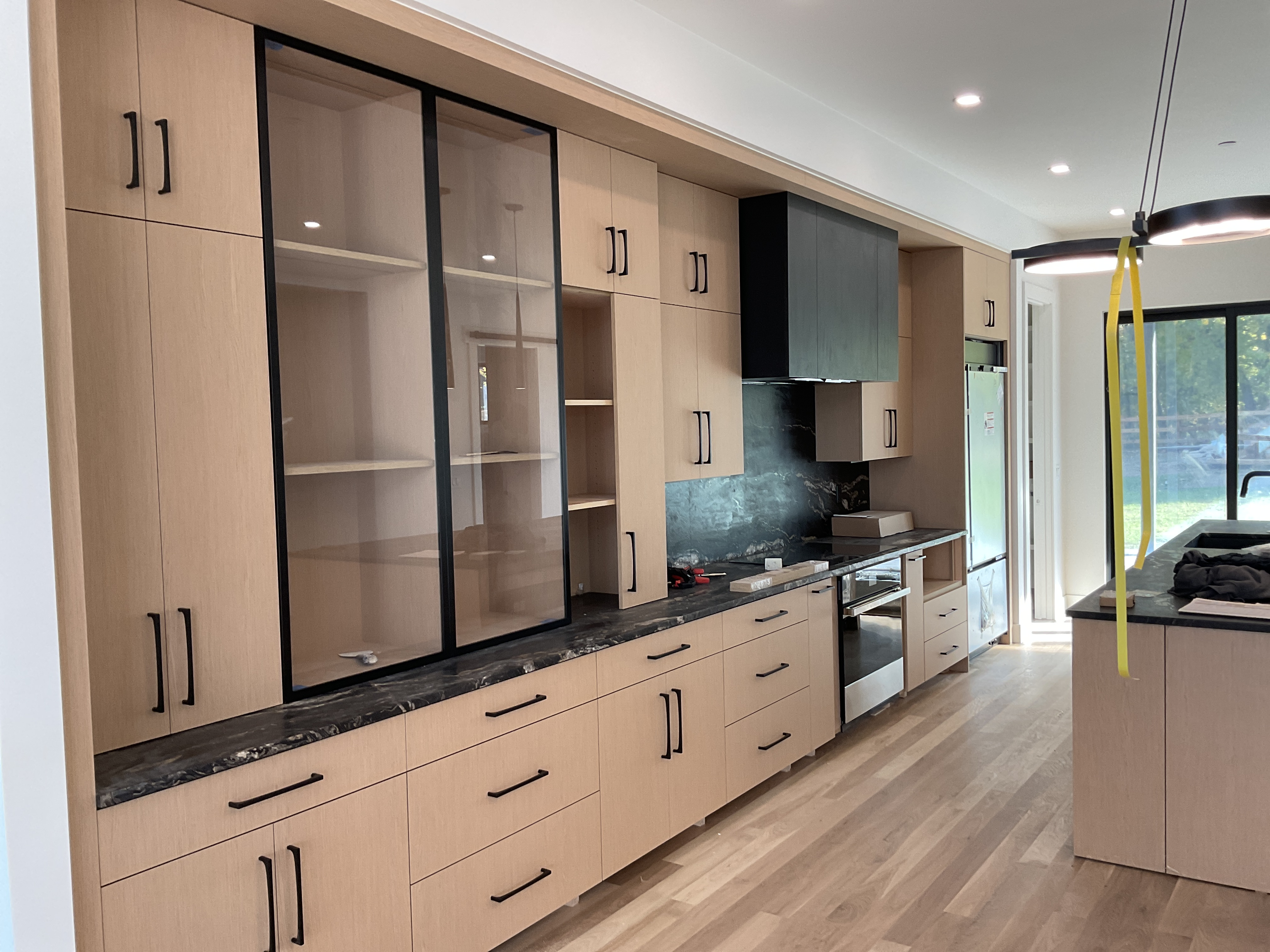 remove all debris from counter add missing door remove yellow ribbon style the countertop glass doors