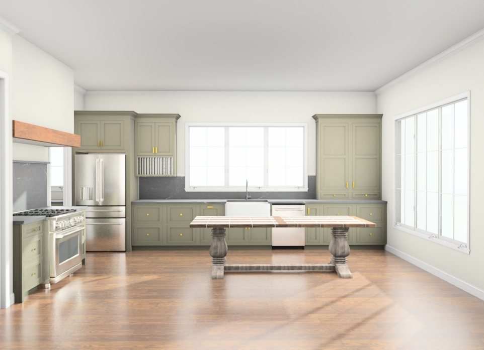 create a hyper realistic image from this kitchen rendering cabinets are a muted fern green countertops and backsplash are soapstone wooded view through the windows with sunlight streaming in do not alter the cabinet layout or details reclaimed wood beam on the hood large rustic antique farm table in walnut wood