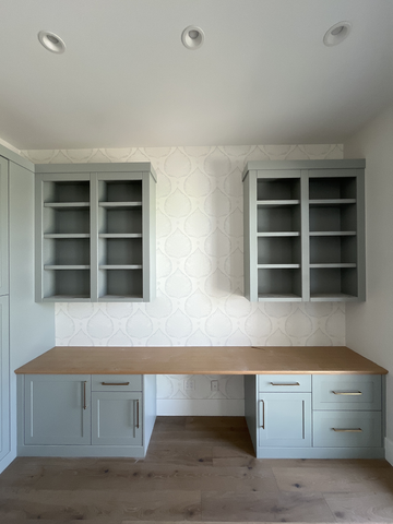 increase the natural light put a simple painting between the uppers with a light above it stage for a home office and add a desk chair