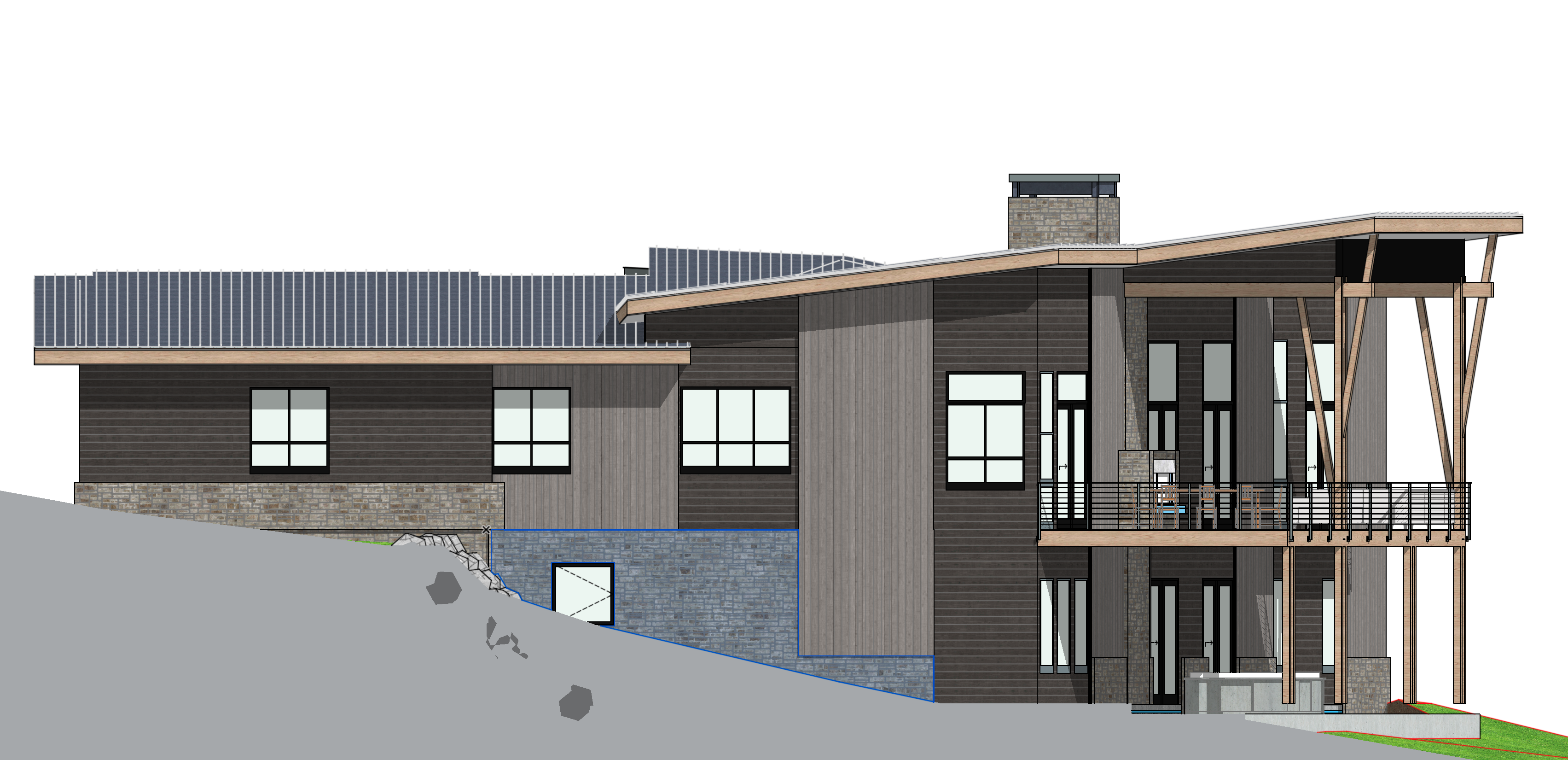 loose watercolor rendered elevation sketch dark grey horizontal siding brown vertical siding snowy pine forest around the home and distant low mountains alpine glow from behind the camera