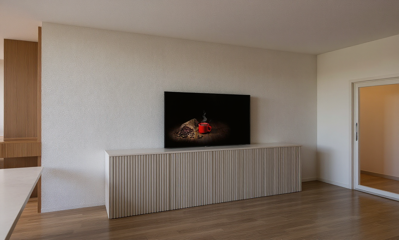 art nouveau exterior shot a modern two story house at the forest and mountain with large circular window on the upper floor featuring sleek architectural design the exterior walls are clad in smooth gray concrete the roof is a warm terracotta with a subtle sheen large glass doors and windows reflect a clear sky allowing natural light to flow through the patio is paved in light stone with minimalist black metal furniture including a table and two chairs the upper balcony is lined with a sleek metal railing the scene is set in a tranquil environment with soft daylight creating a serene elegant atmosphere architecture