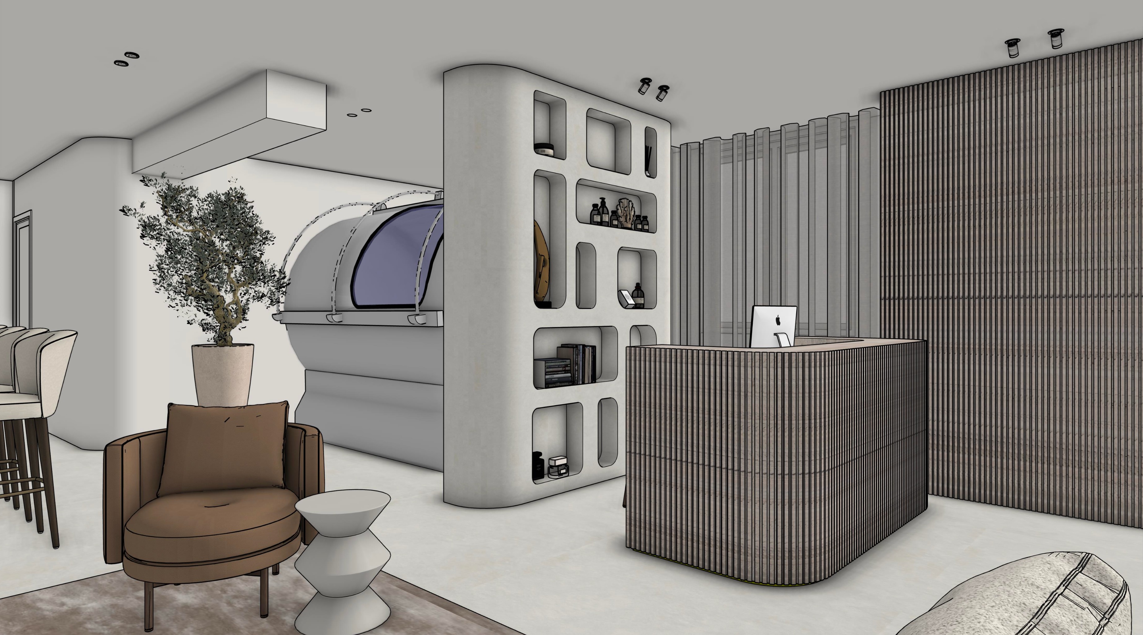 onder de stoel is een harig taupe kleurig vloerkleed de rest van de vloer is een vietvloer in een lichte beige kleur de desk is van travertin steen allle meubels zijn van minotti