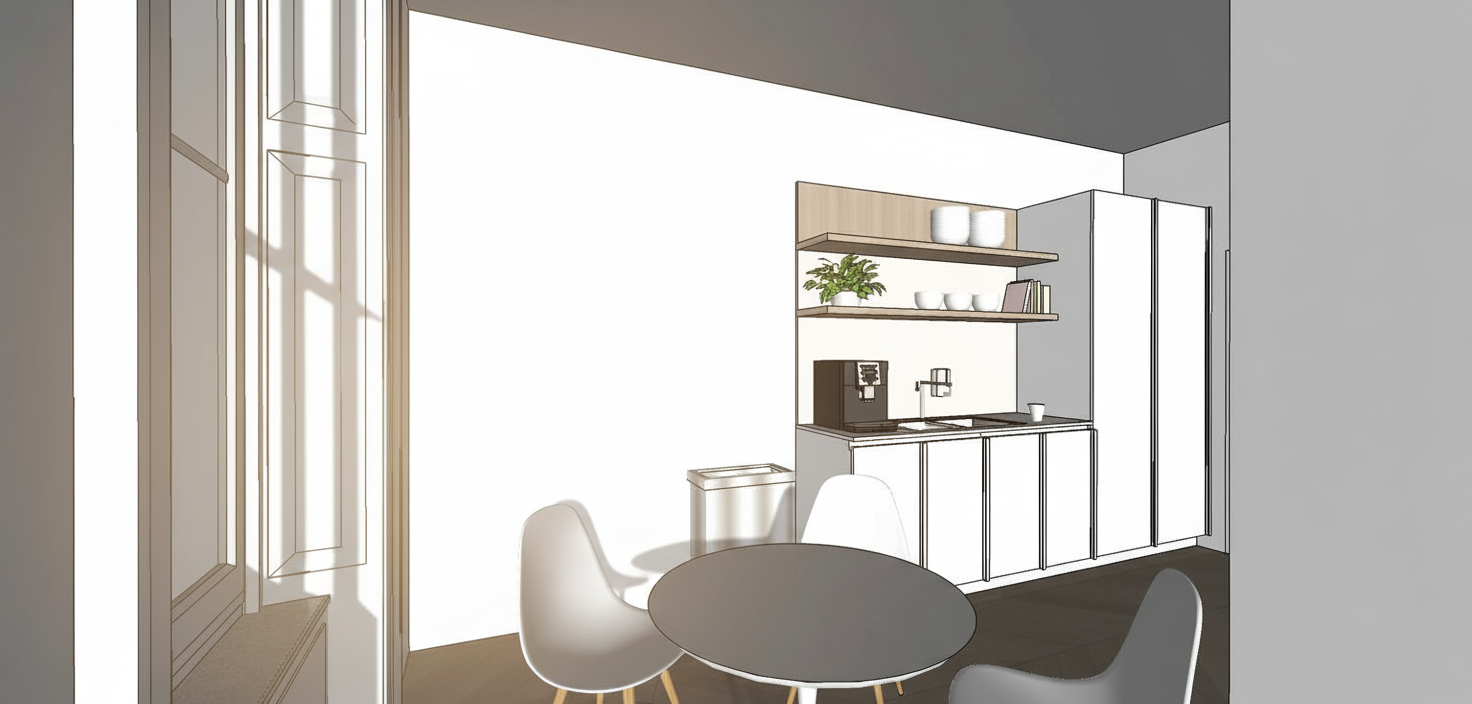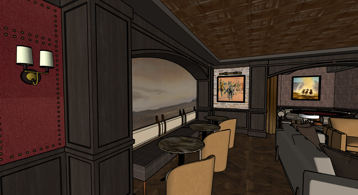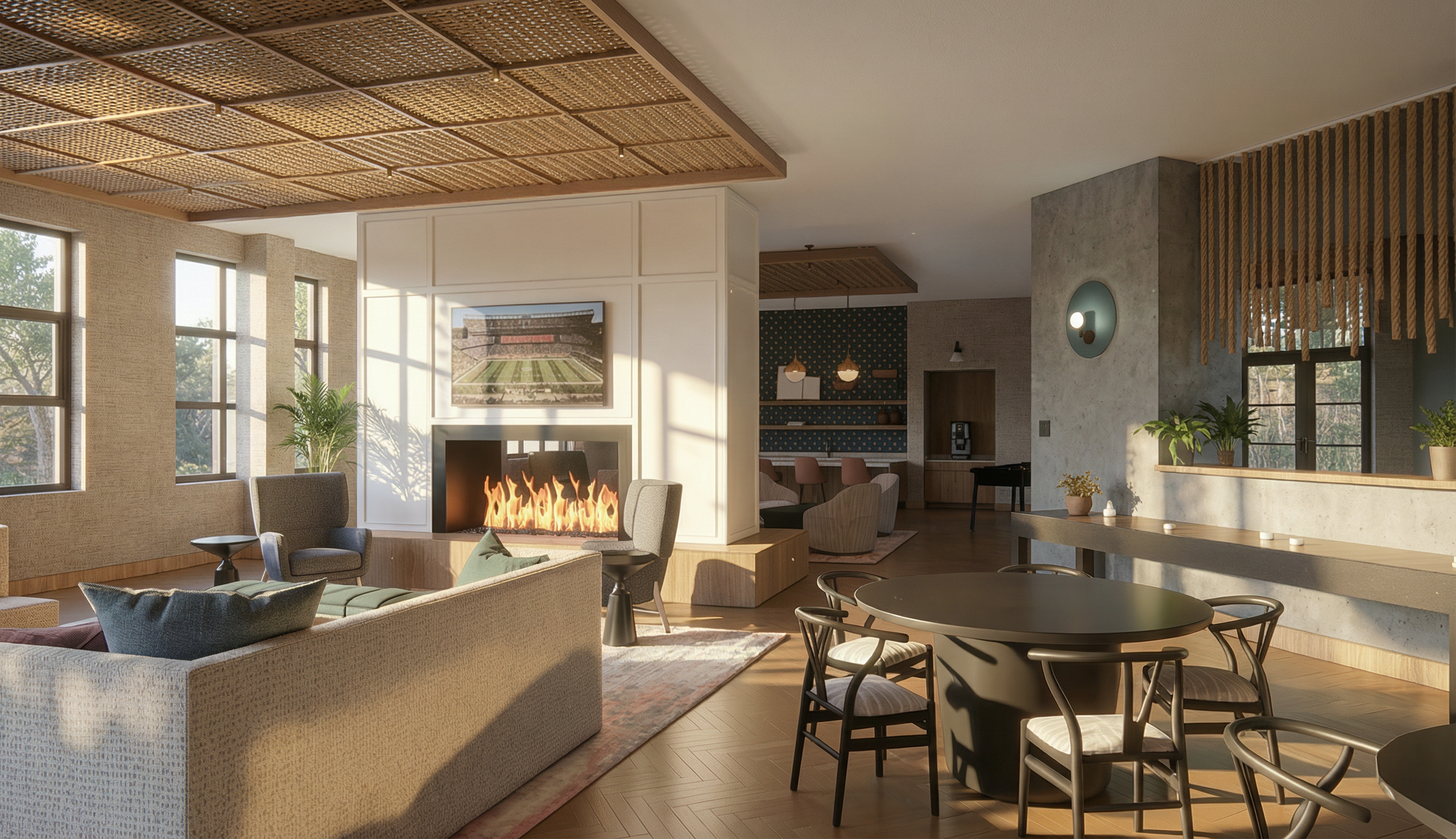 create a warm cozy rendering of this space keeping colors and all materials as is