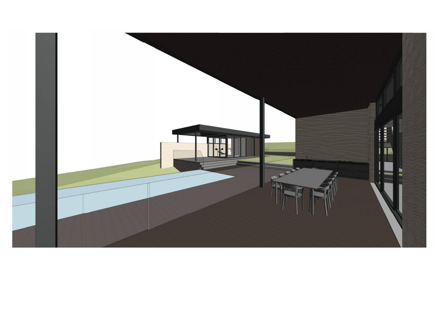 use the uploaded image as the exact architectural base model do not redesign or modify the geometry do not alter the massing roof forms proportions glazing size layout or pavilion connections only enhance the render by applying realistic materials and environment rammed earth walls warm beige horizontal striations dark charcoal vertical cladding on selected volumes matte black aluminum window and door frames natural timber soffit under all roof overhangs matte black metal roof fascia and trims site landscape lush green grass covering the terrain no desert plants soft minimal landscaping with low grasses and shrubs near edges keep planting sparse and modern reflective infinity pool background rolling grassy hills or meadow landscape soft open sky lighting render style warm dusk golden hour lighting interior glow visible photorealistic architectural visualization 8k sharp reflections natural shadows critical instruction exact geometry from the uploaded model must be preserved no changes to form height massing or composition