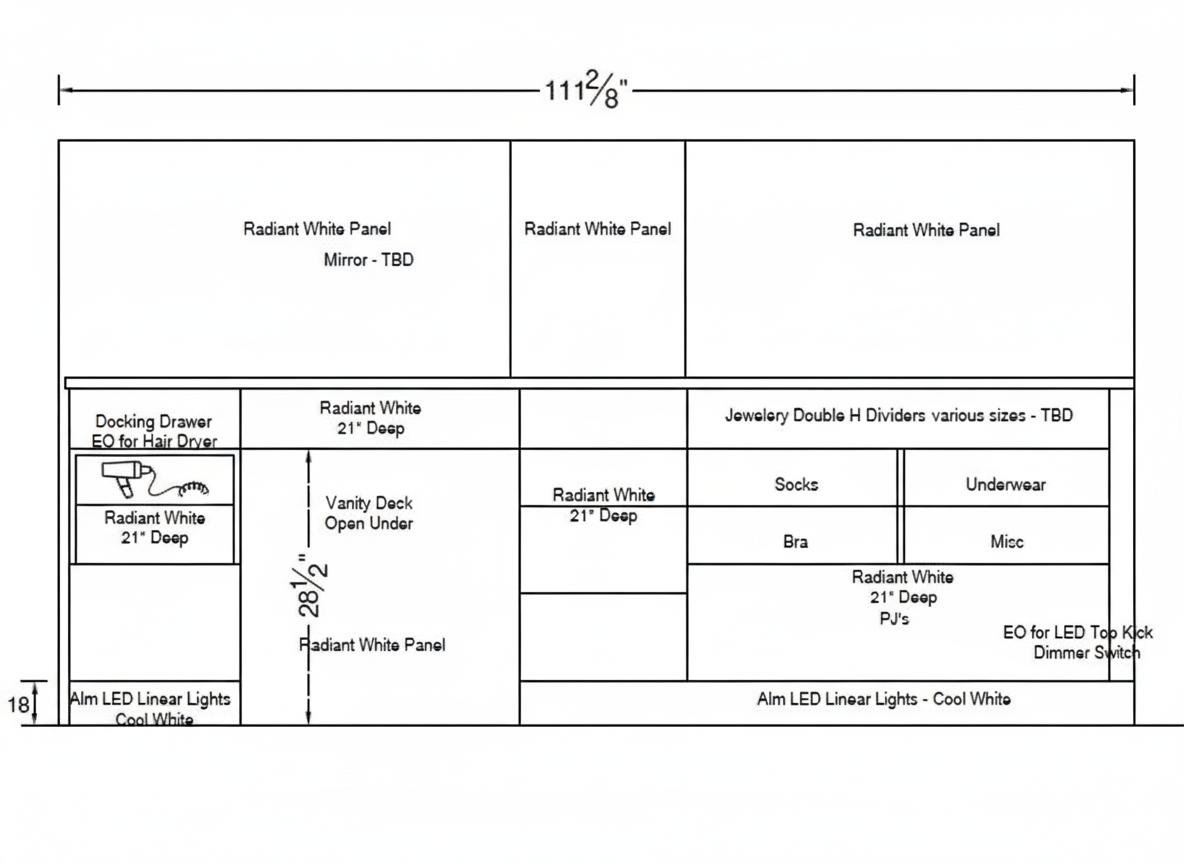 horizontal sections base left section eighteen inches wide featuring a docking drawer for a hair dryer center left vanity desk thirty inches wide featuring an open area underneath for seating center right eighteen inches wide consistent with the left side cabinet depth right section forty five inches wide containing specialized storage for jewelry socks underwear and bras vertical heights countertop height thirty four inches from the floor vanity knee clearance twenty eight and half inches high upper panels a series of radiant white panels extending up to sixty inches high