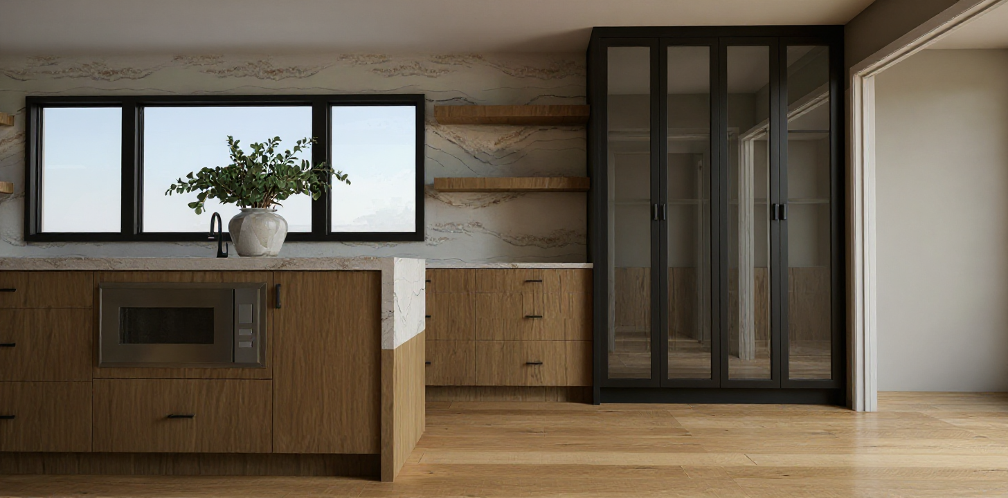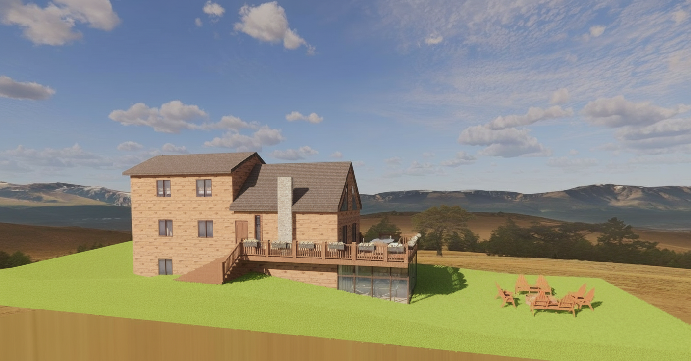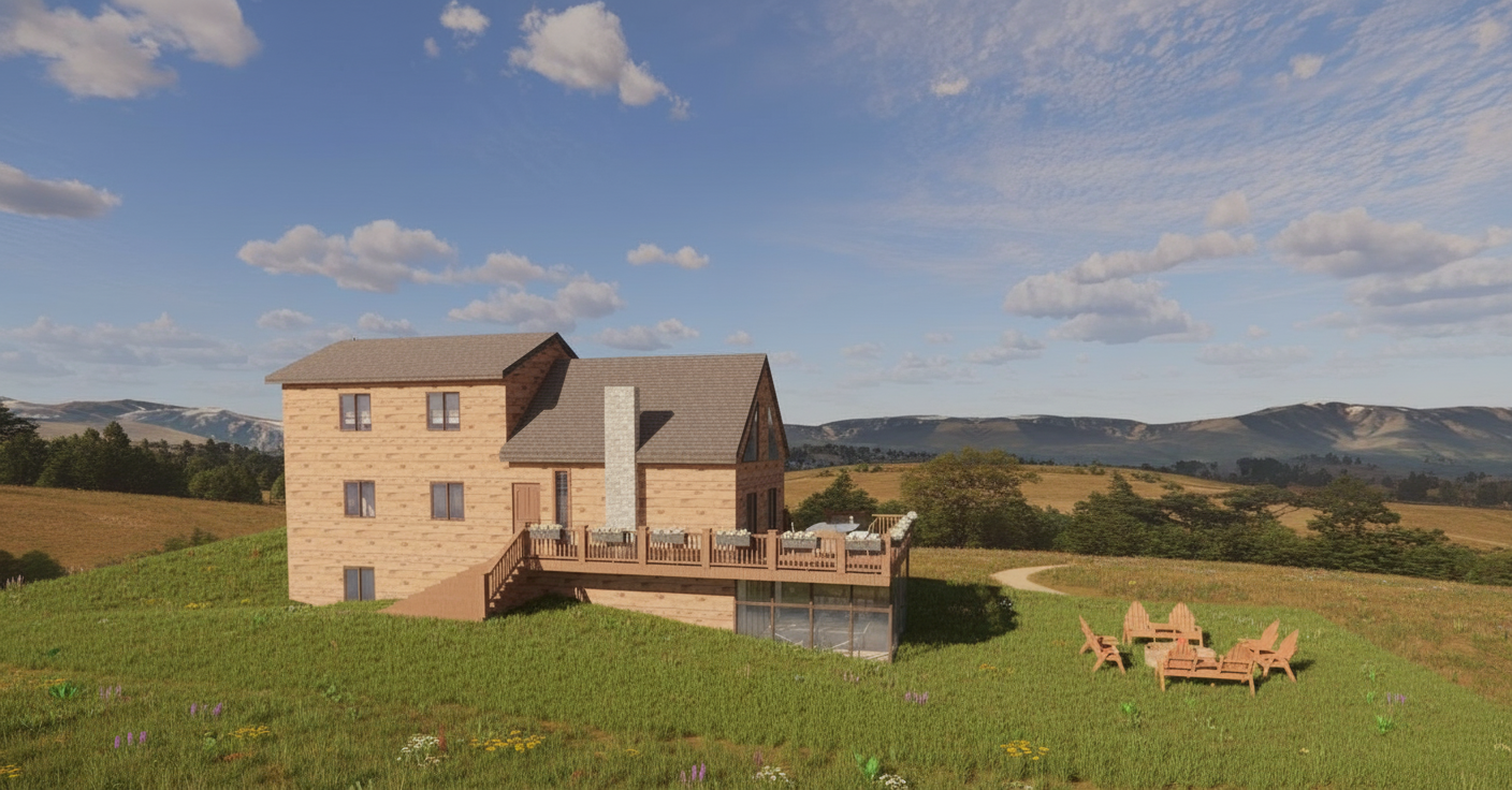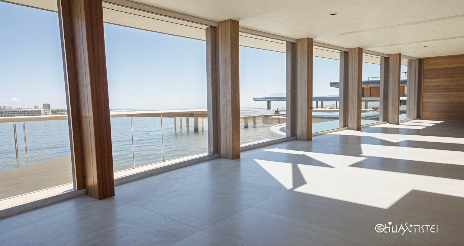 render a modernist architectural building with sleek angular lines use a palette of light gray for the concrete deep charcoal for the window frames and reflective glass the building should stand in an urban landscape with a clear blue sky and warm sunlight to create a bright and inviting atmosphere add subtle shadows for depth and dimension highlighting the building s geometric design on the black metalic pots on each balcony some green plants hanging brown color transfor to wooden slats
