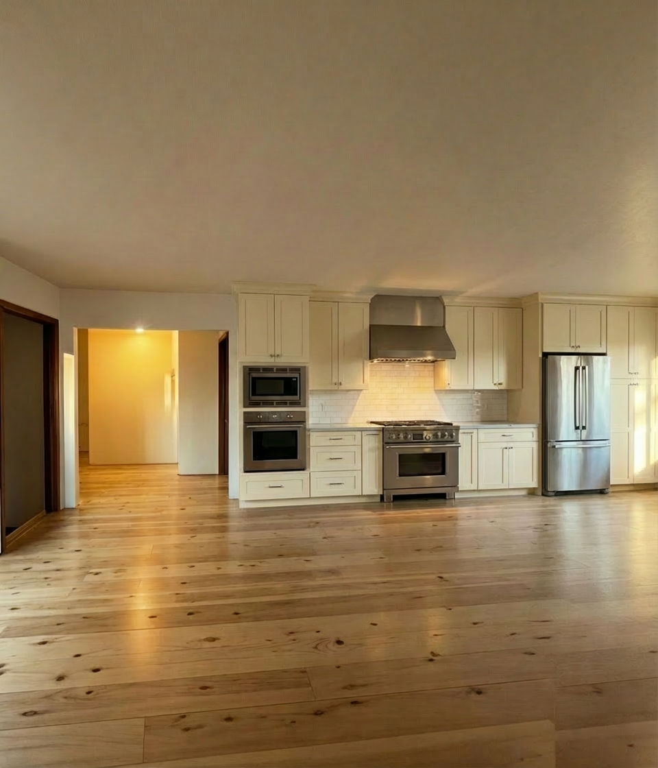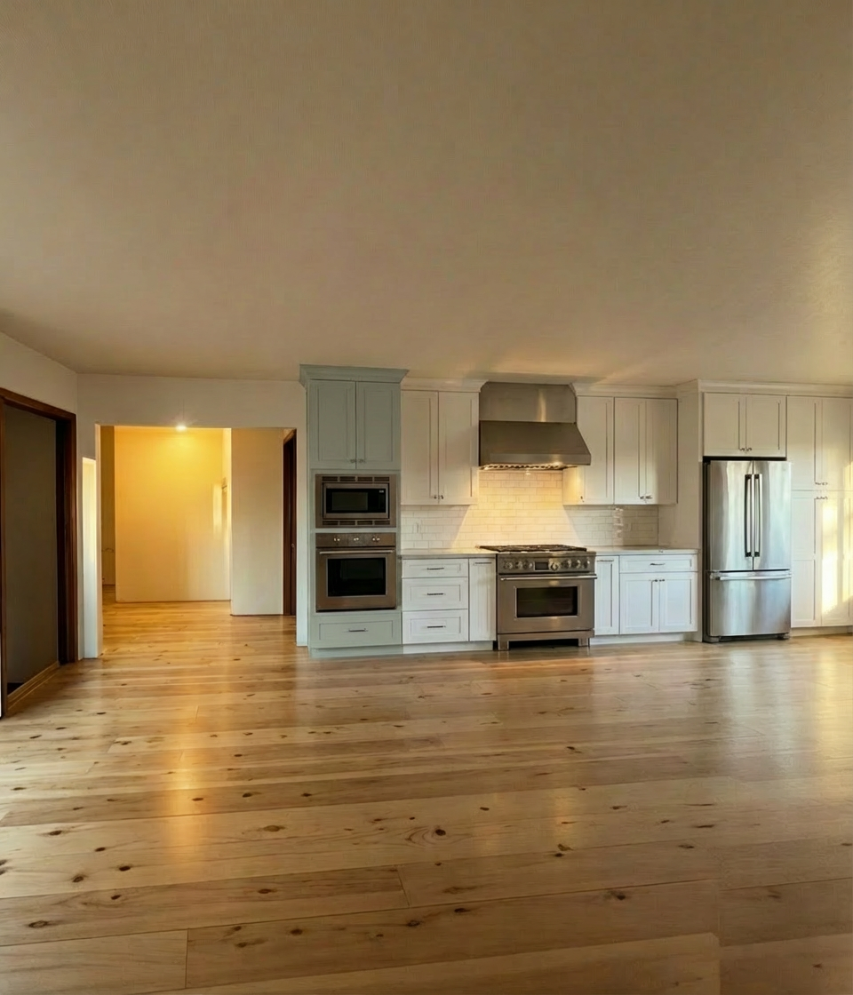 do not change the layout of this kitchen change the color of the cabinets above the fridge to the same color as the cabinets above and below the oven