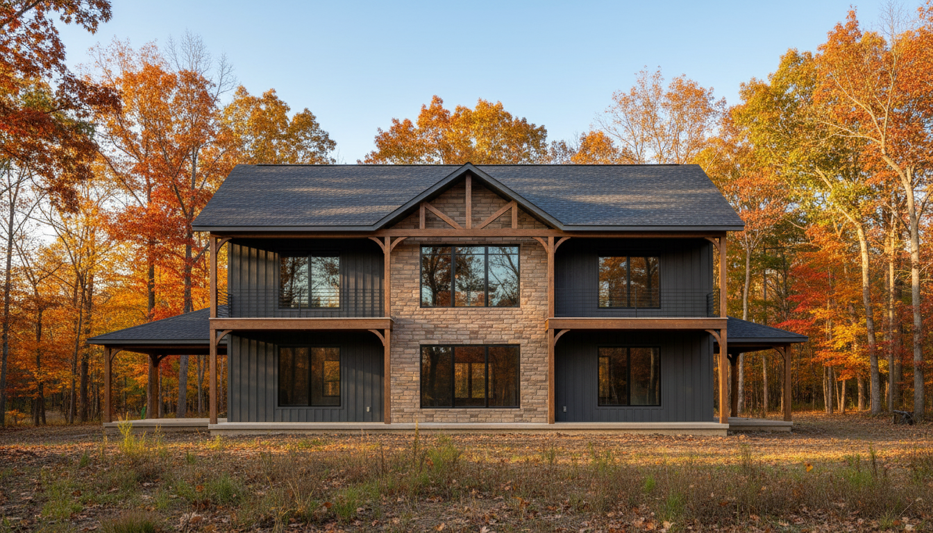 modernist wide angle shot focus on a walkout basement on a sloping lot with oak and maple trees and make the wooden accents stand out with black grids in windos architecture