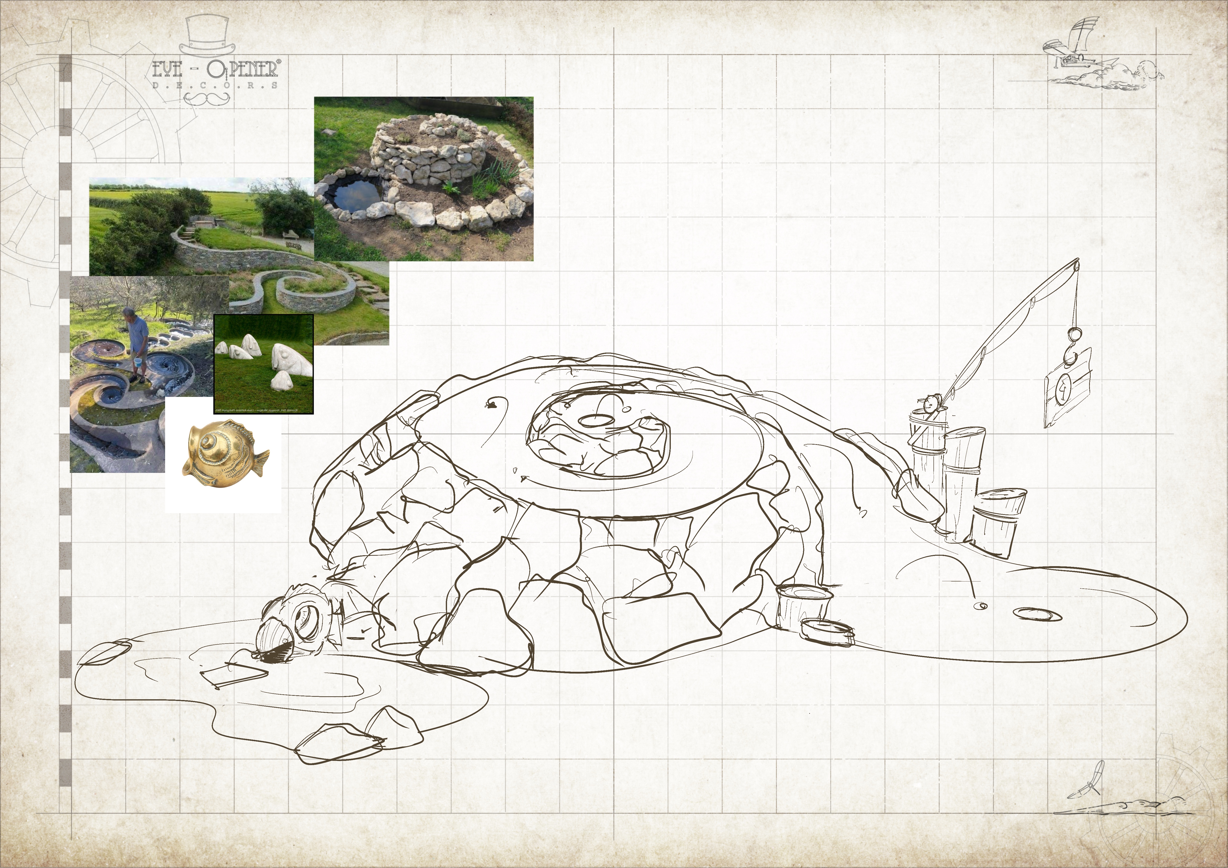 design me a minigolf cours based on water theme with wooden elements and playful decors architecture